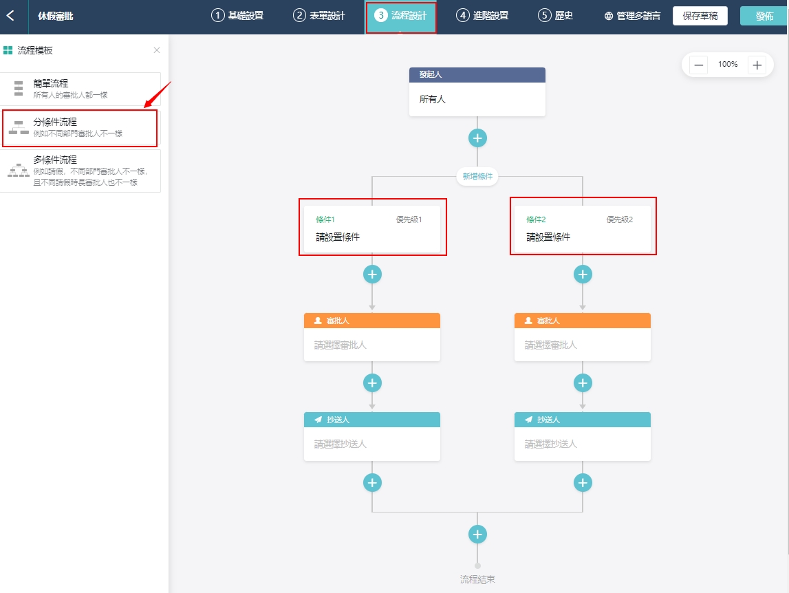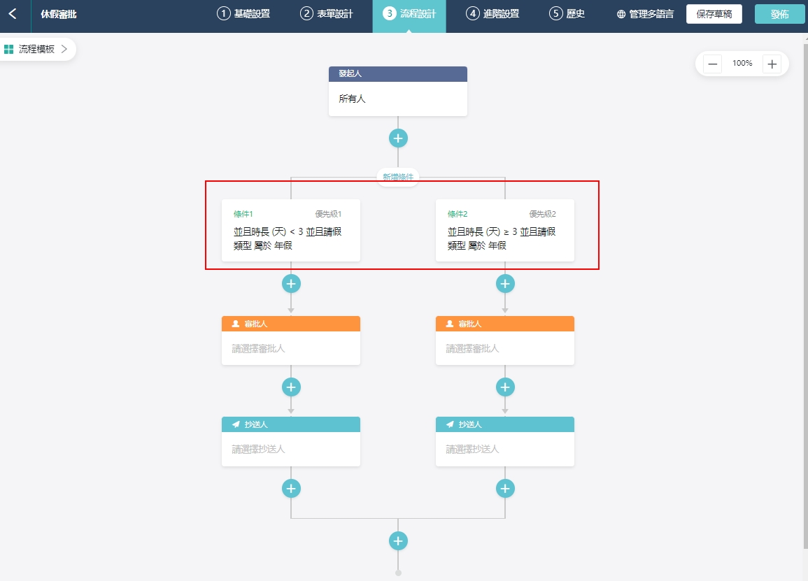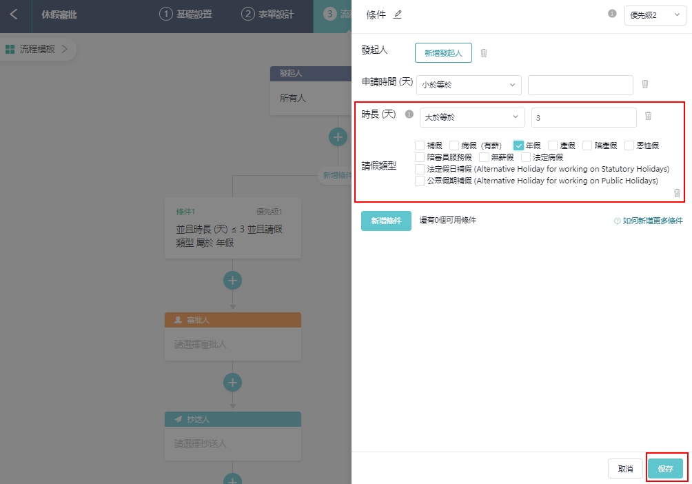 操作流程: ① 进入流程设计,点选左侧 「分条件流程」 ② 点选 「条件1」 ,按 「当员工请假天数小于3天,且请假类型为年假」 的要求进行设置,时长小于3,请假类型选择年假,设定后,点选 「保存」 ③ 点选 「条件2」,按 「当员工请假天数大于等于3天,而请假类型为年假」 的要求进行设置,时长大于等于3,请假类型选择年假,设定后,点选 「保存」 ④ 设定完后条件分支显示如下,再进行各分支的 「审核人」 和 「抄送人」 设定就可以