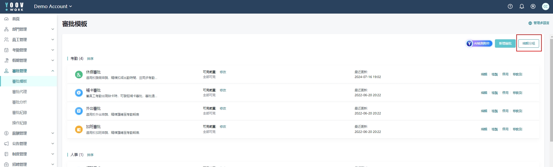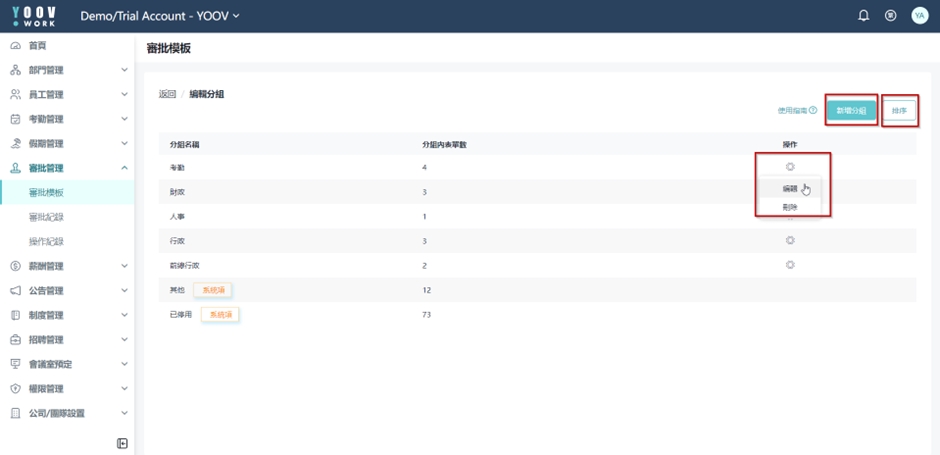 为了让管理员更容易管理各项审批模板,系统支援为模板分组的功能。除了预设分组外,可以点选页面中"编辑分组"以管理审批分组内容。