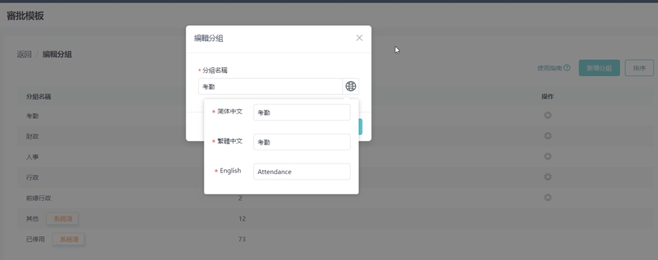 如需设置不同语言的审批模板分组名称,可以点选右方的地球图示,然后按指示输入对应不同语言的显示名称。当输入好有关资料,会在对应的语言介面看到已设置好的显示名称。