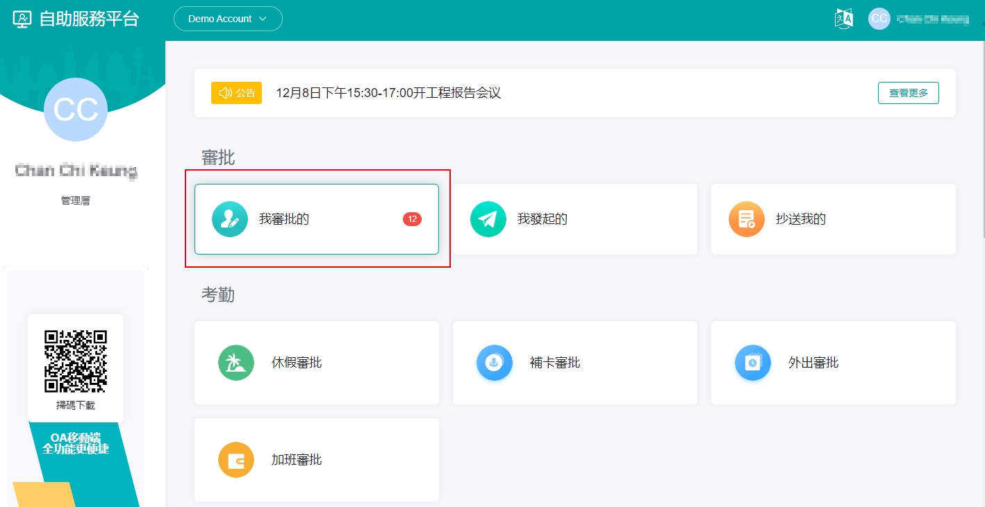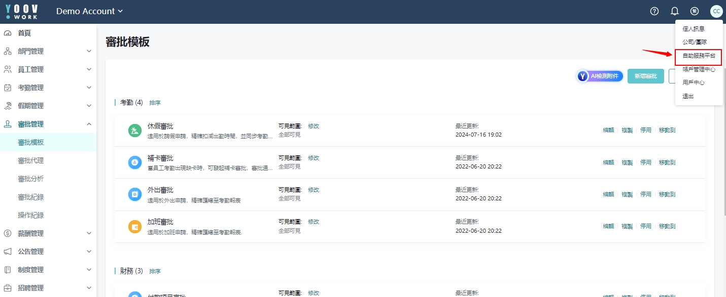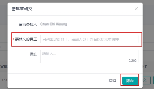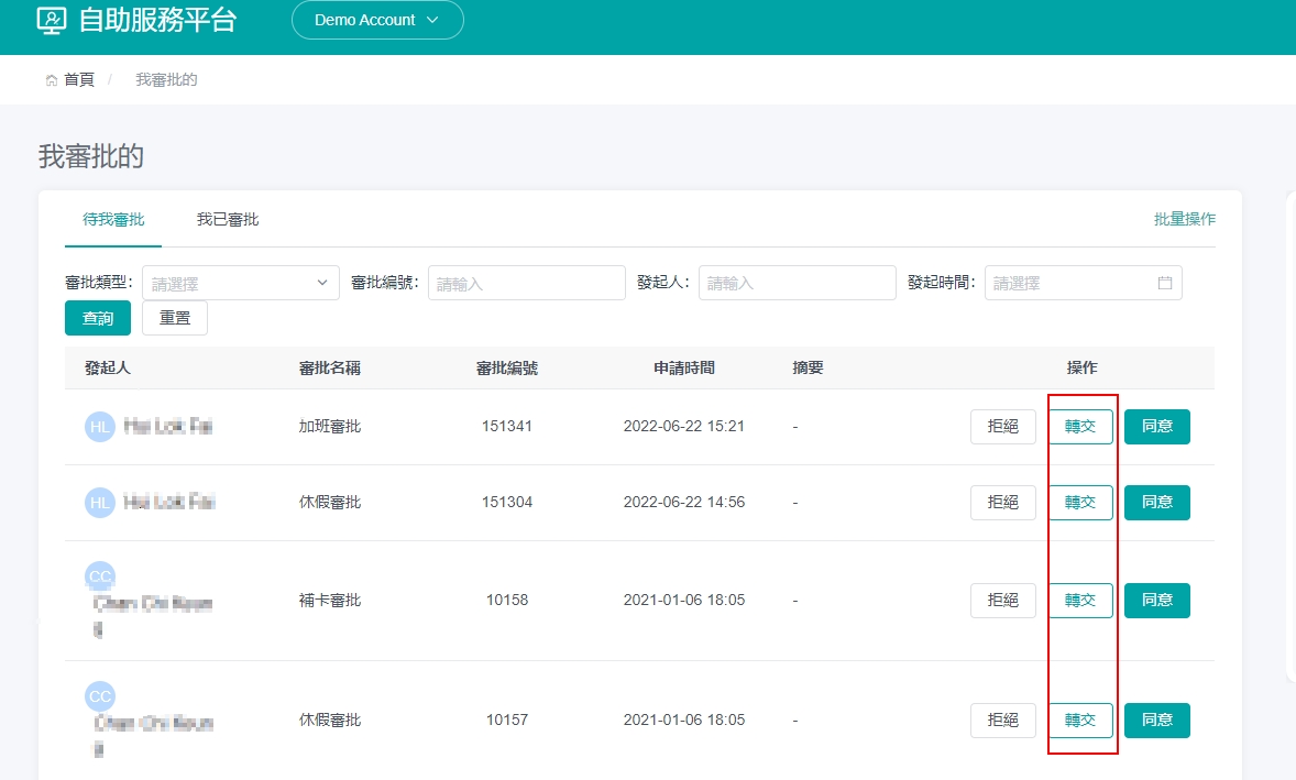 操作步骤: 方法 ①[审核管理]>[审批记录]> 点选未核准的操作下的 「转交」 方法 ② 在自助服务平台上,点选 「我审批的」