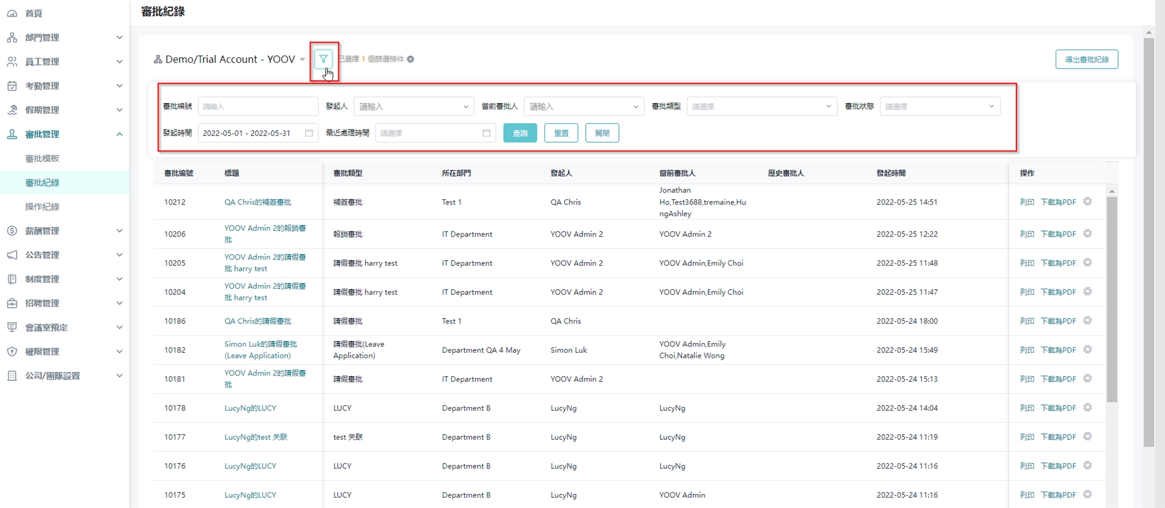 系统亦设有筛选功能,可按需要输入相应的类型、状态、时间等。帮助管理员更准确而且快速地寻找审批纪录,节省时间。