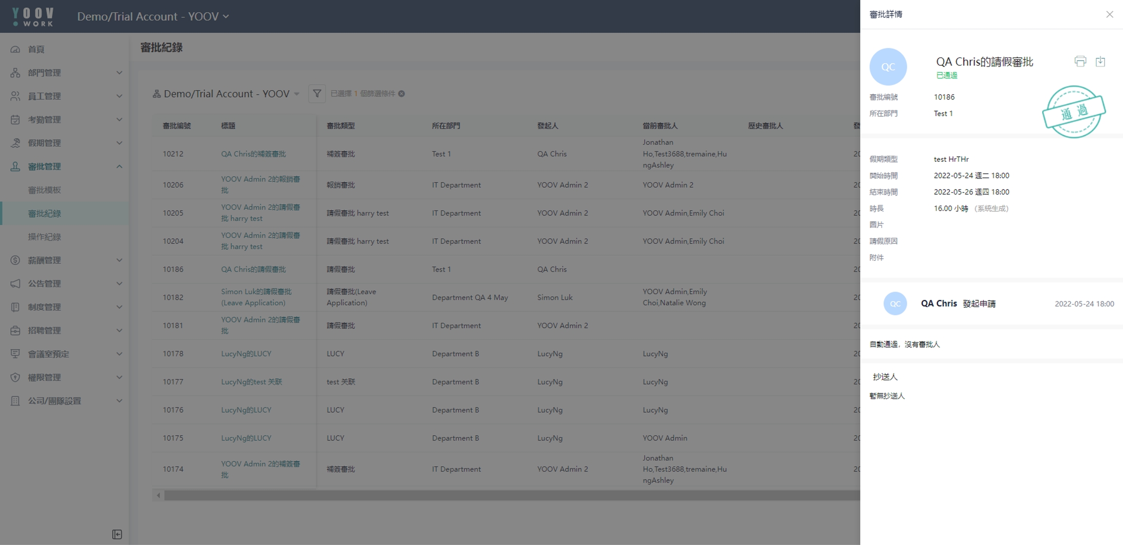 同时亦可以点选各个审批标题查看的项目详情,包括:请假时长、类型、批核状态等 。