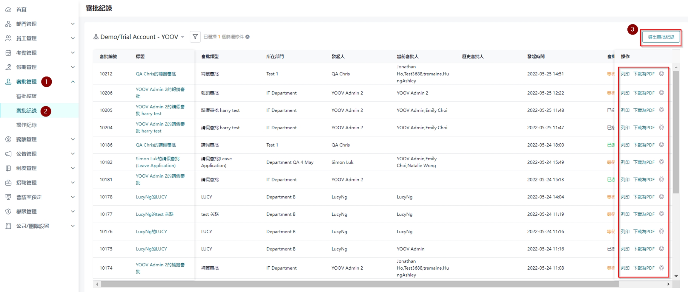 管理员可于系统中查看、转交、导出以及下载审批纪录。