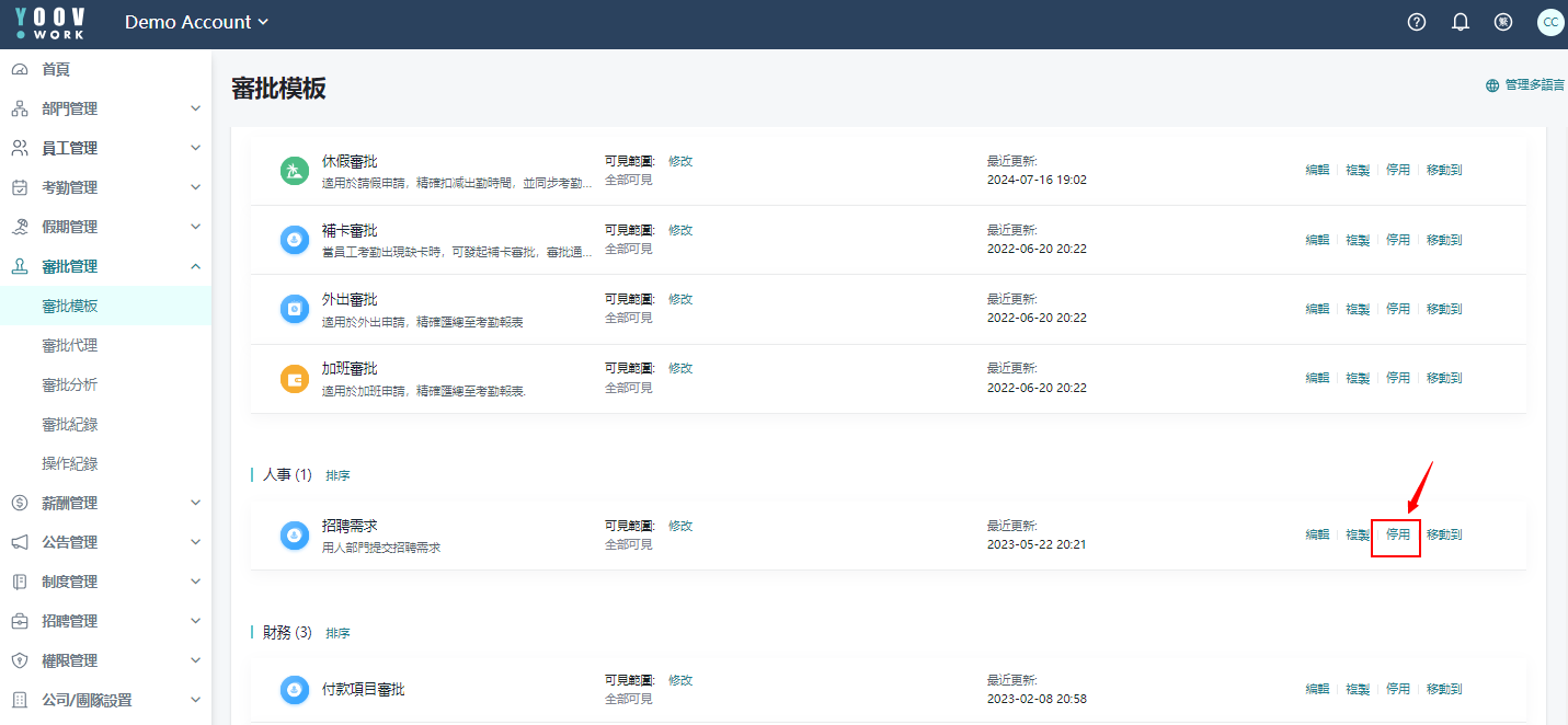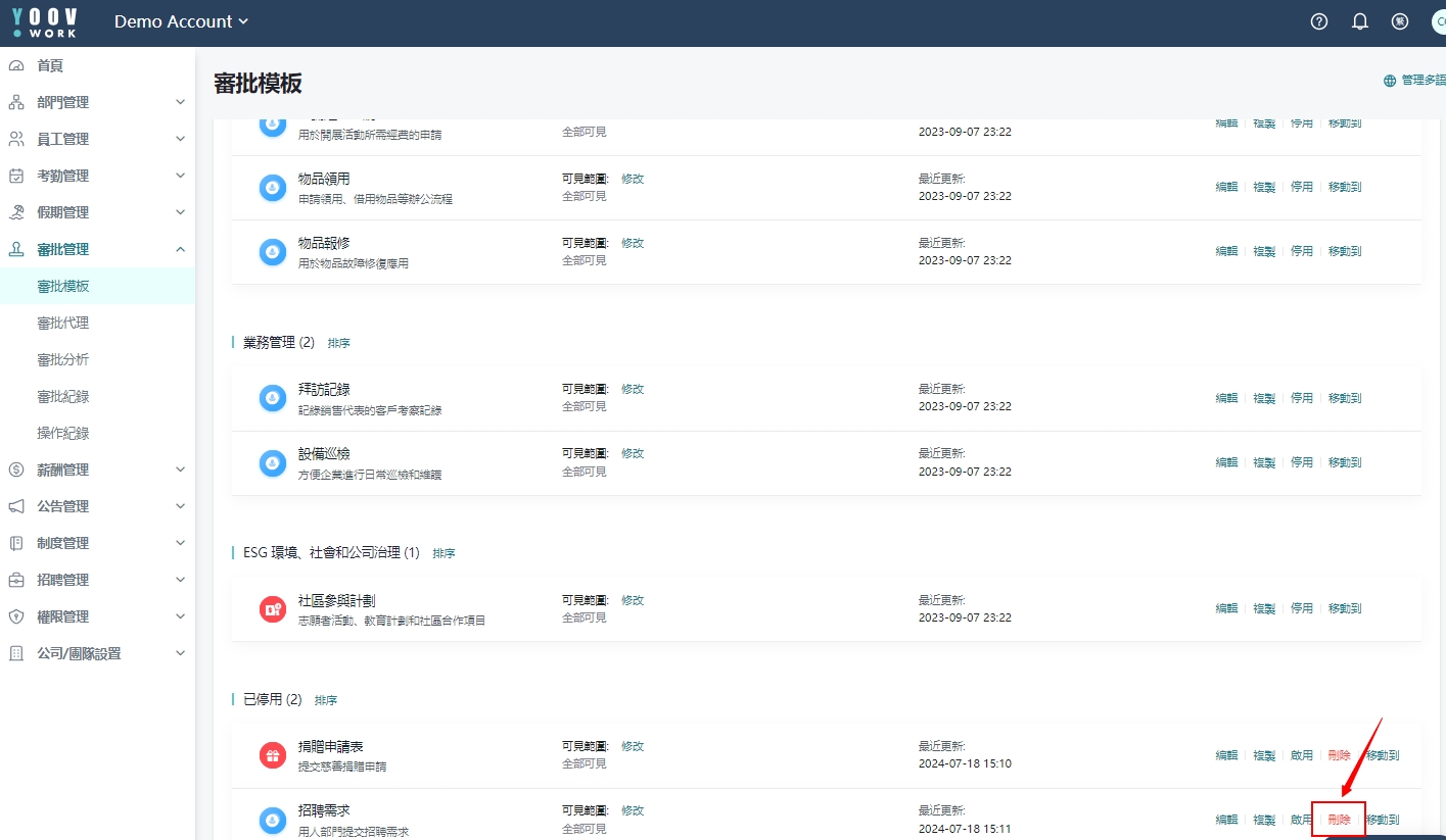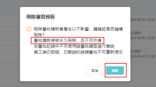 操作步骤: ①[审核管理]>[审批表单]> 点选对应审核表单下的 「停用」 ② 停用后的审核表单,即显示在页面的已停用群组里,点选 「删除」 ③ 点选 「确认」,即可完全删除审核表单, 审批范本将永久删除,且不可恢复