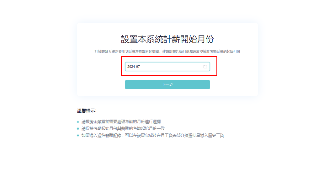 * 薪酬起始月份代表系统开始生成薪酬和工资表的月份，例如设置 2024 年 7月， 即系统会在2024 年 7 月开始计算员工薪酬并由该月份开始生成工资表。而 2024 年 7 月以前，将不会显示。