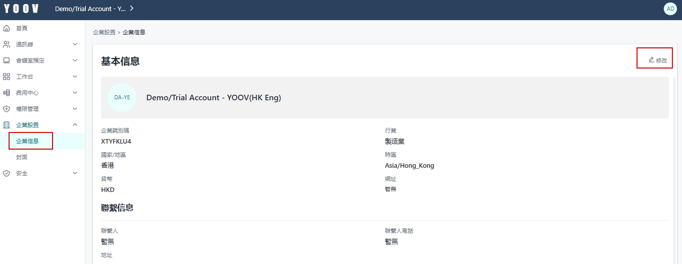管理员需先在设定页面中确认公司基本资料是否正确,如果有误请按[编辑]修改。