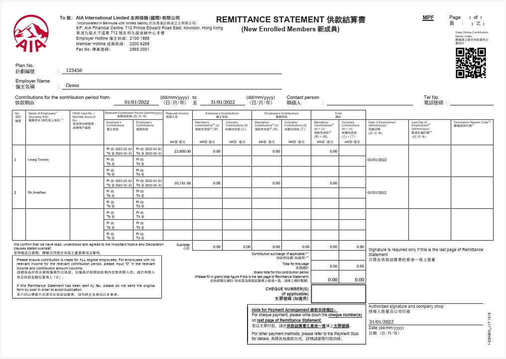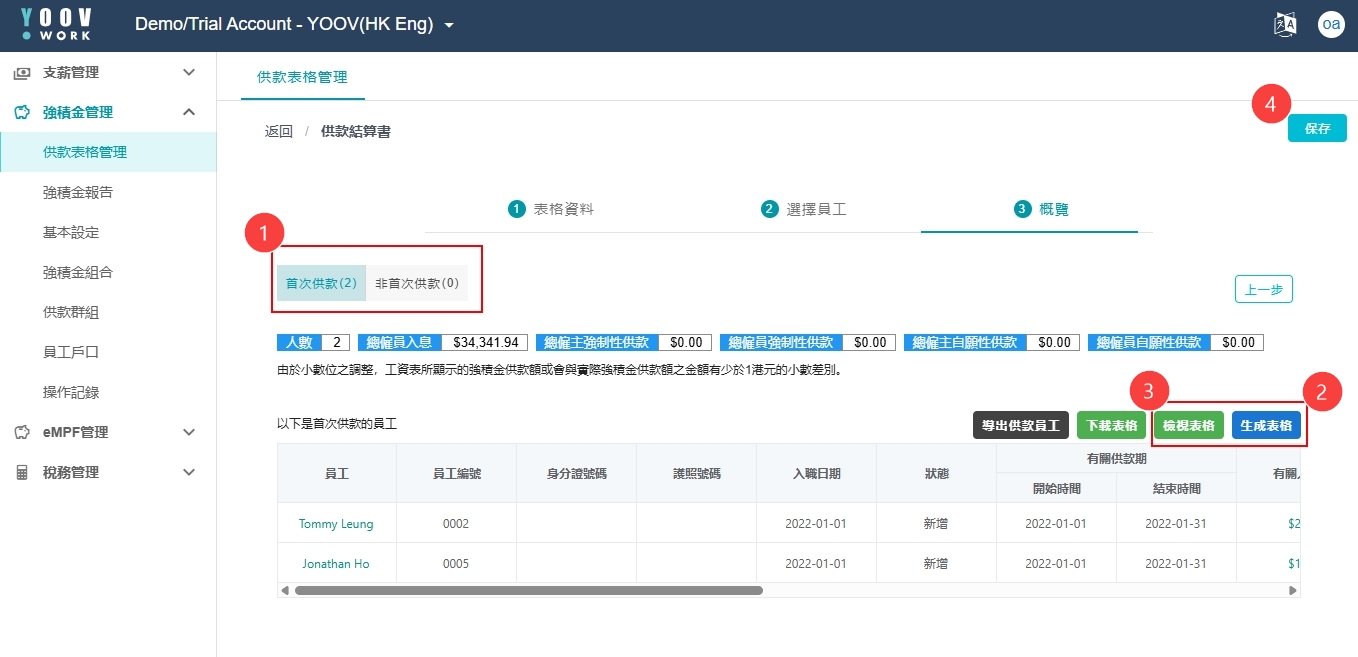 管理员可以看到那些员工是首次供款,那些员工是非首次供款。 当确认所有资料无误后请按[生成表格]然后按[检视表格]。 及后管理员应该会看到一份 PDF 文档,只需下载并发送给相关强积金公司即完成。