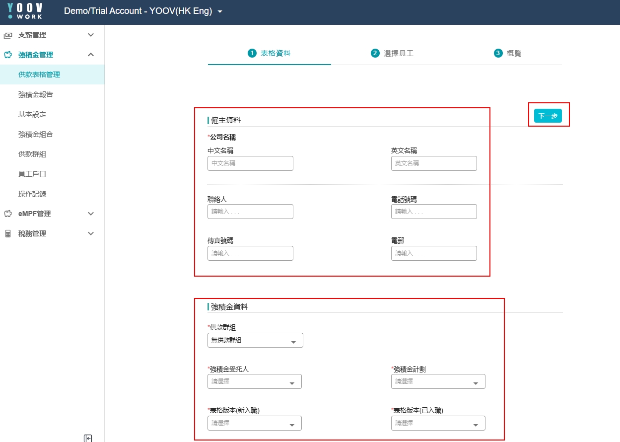 1. 管理员可以在强积金管理页面按[新增表格]。 2. 进入表格页面后,管理员请先确认公司资料是否正确。如发现错误可在此修改,但修改后的内容并不会保留到下一次。如果想系统保留公司基本资料,请在上方[1. 基本设定]中设置。 3. 管理员可以在付款群组中点选设定的群组,然后系统就会自动载入其他栏位的强积金资料。 4. 管理员亦需在下方打上计划编号用以提交文档给强积金公司。 5. 管理员可因应公司需求拣选用付款银行、支付方式和提交表格的日期。 6. 当确认所有资料无误后请按[保存]然后按[下一步]。 选择员工