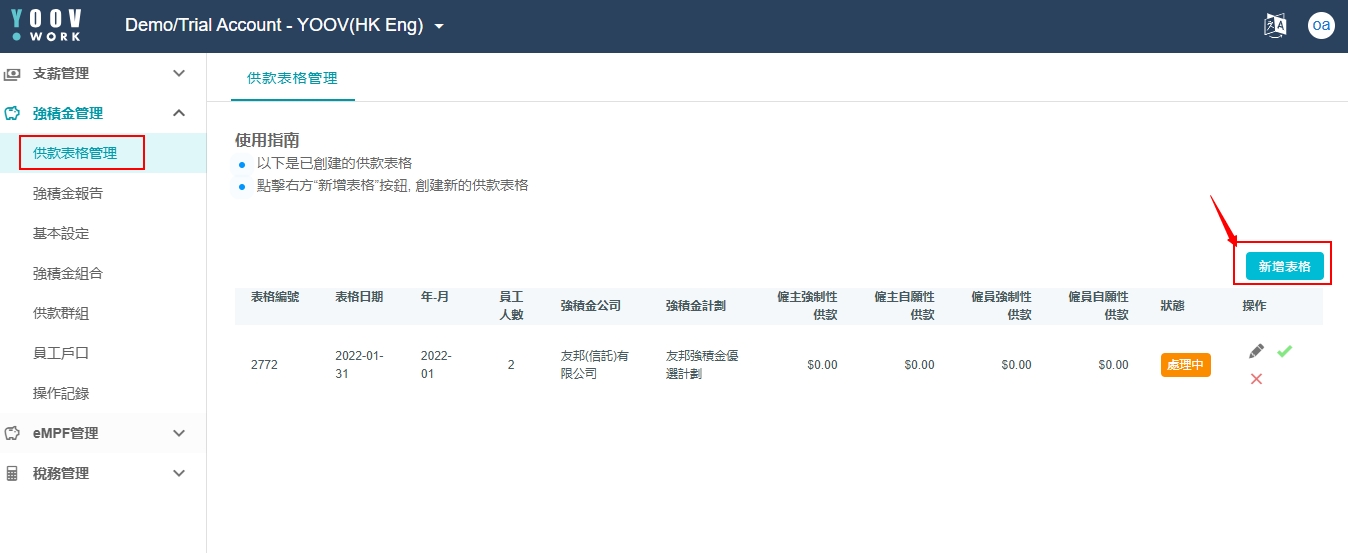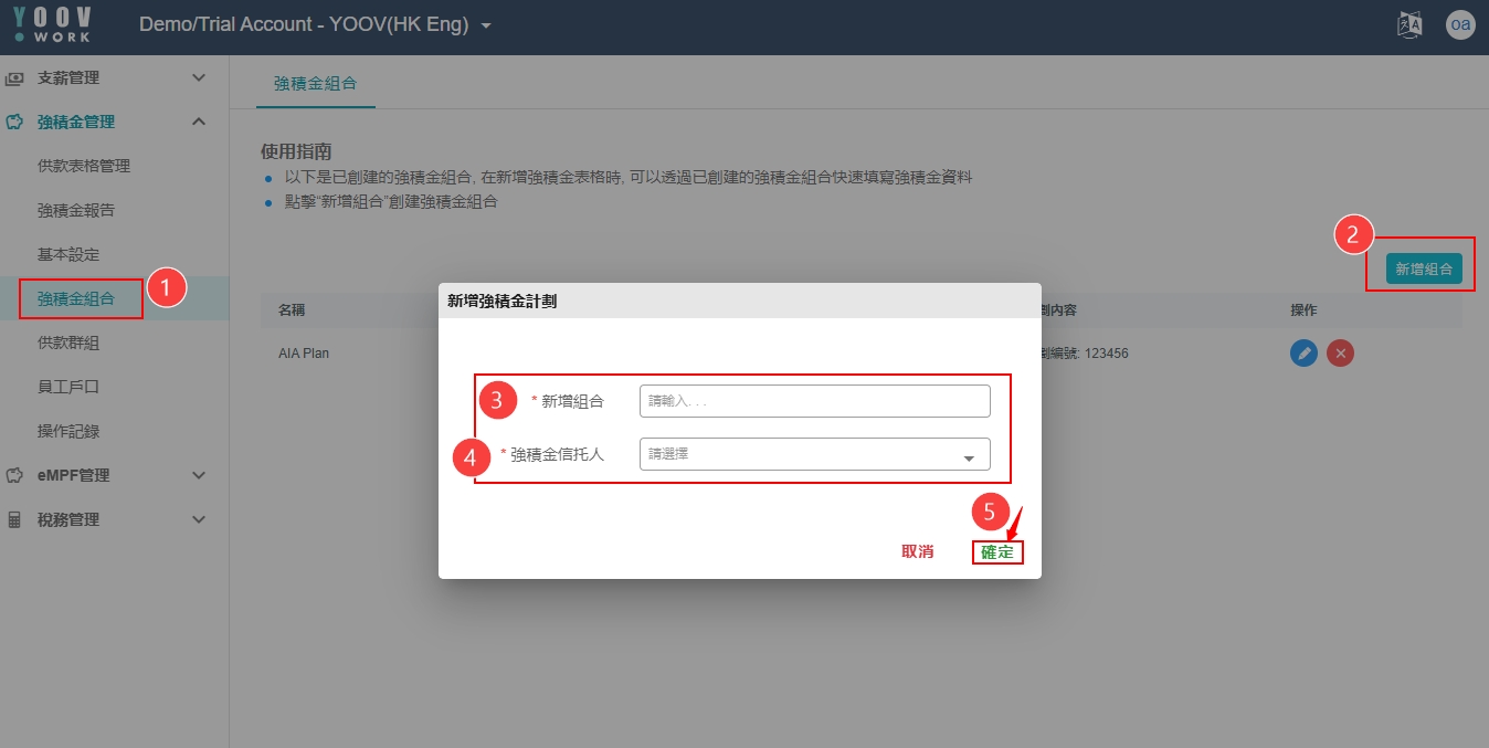 管理员需在系统中设定各款员工所需的强积金组合。请根据下图指示输入即可新增。