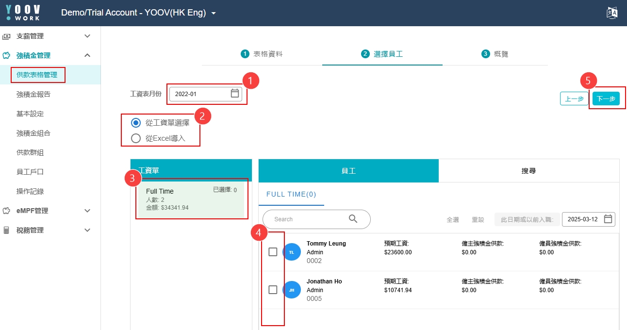 请先选择工资表月份,然后拣选适合计划的员工。当确认所有资料无误后请按[保存] 然后按[下一步]。