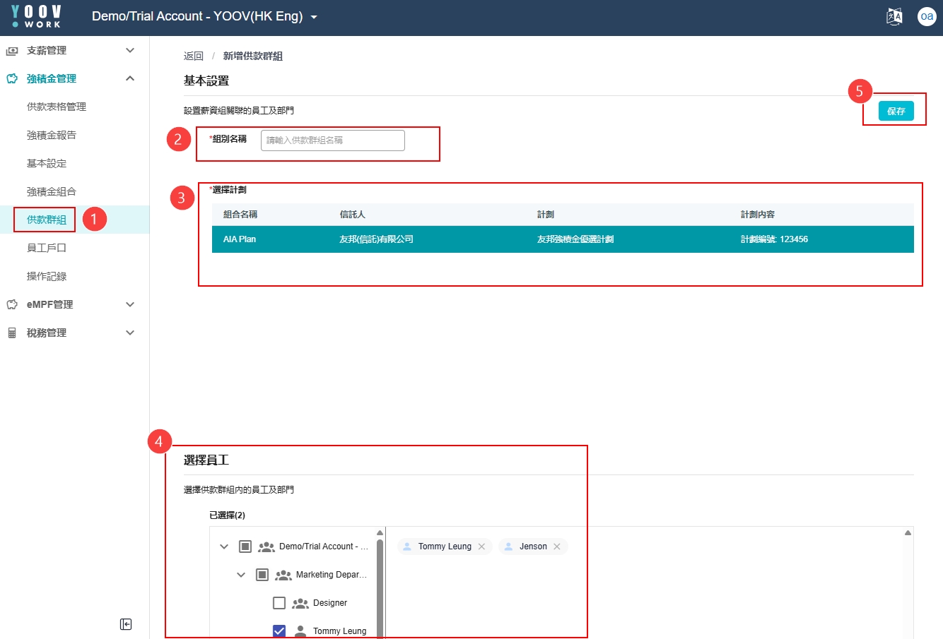 1. 页如公司有多于一个强积金组合,管理员可以在[新增供款群组]设定员工适用的强积金组合。 2. 进入设定页面后,管理员需选择强积金组合并拣选适合的员工。当确认资料无误后, 请输入组别名称然后按[保存]就可以了。