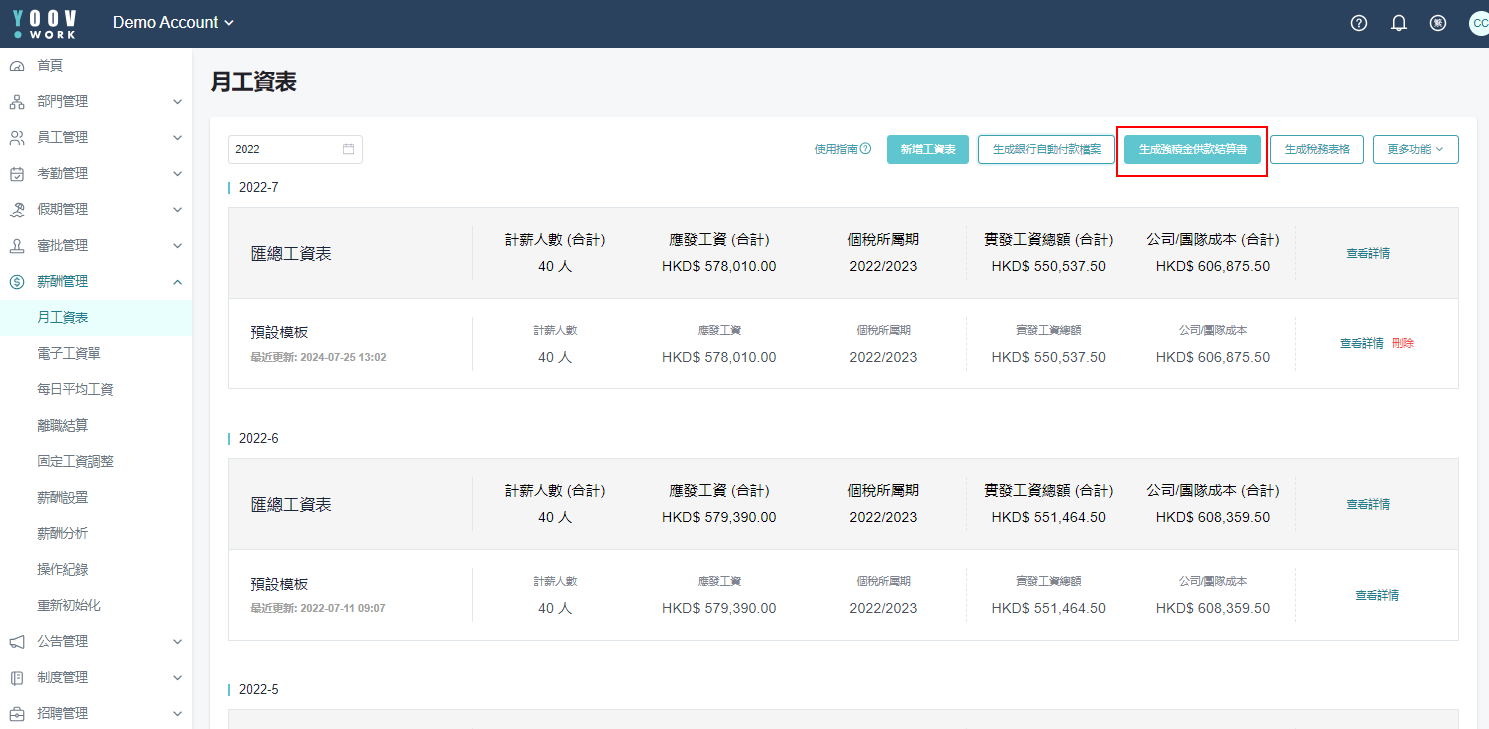 生成工资表并完成核对后,便可按[生成强积金供款结算书]生成电子档案提交至相关机构。