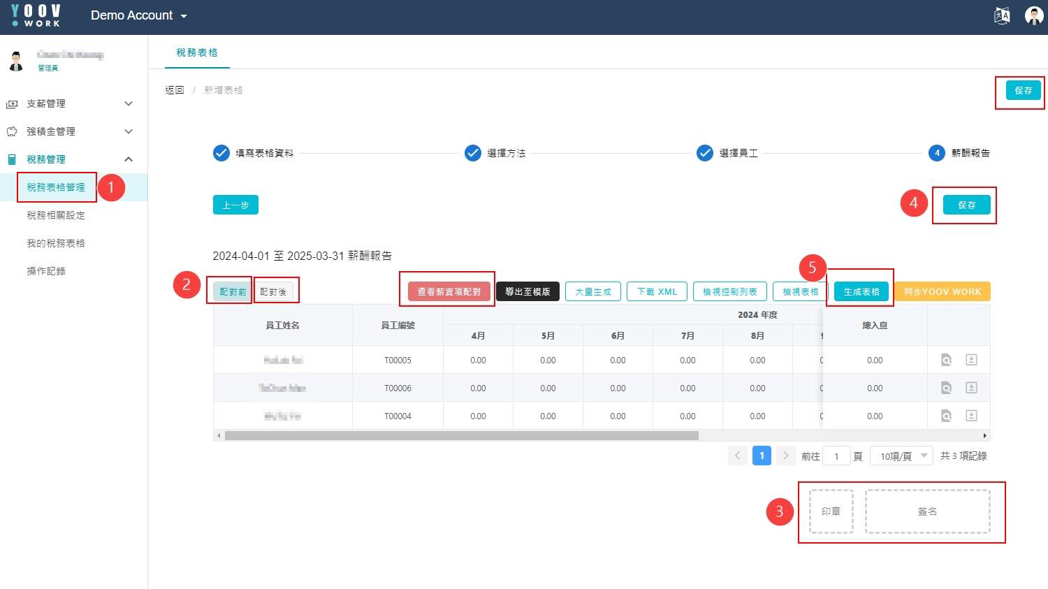 ④ 【薪酬报告】 请先按[生成表格]制作税务表格。系统生成后便可以按[检视表格]查看税表。当确认无 误后请按[保存]。