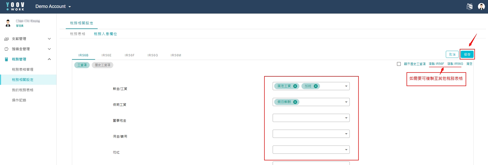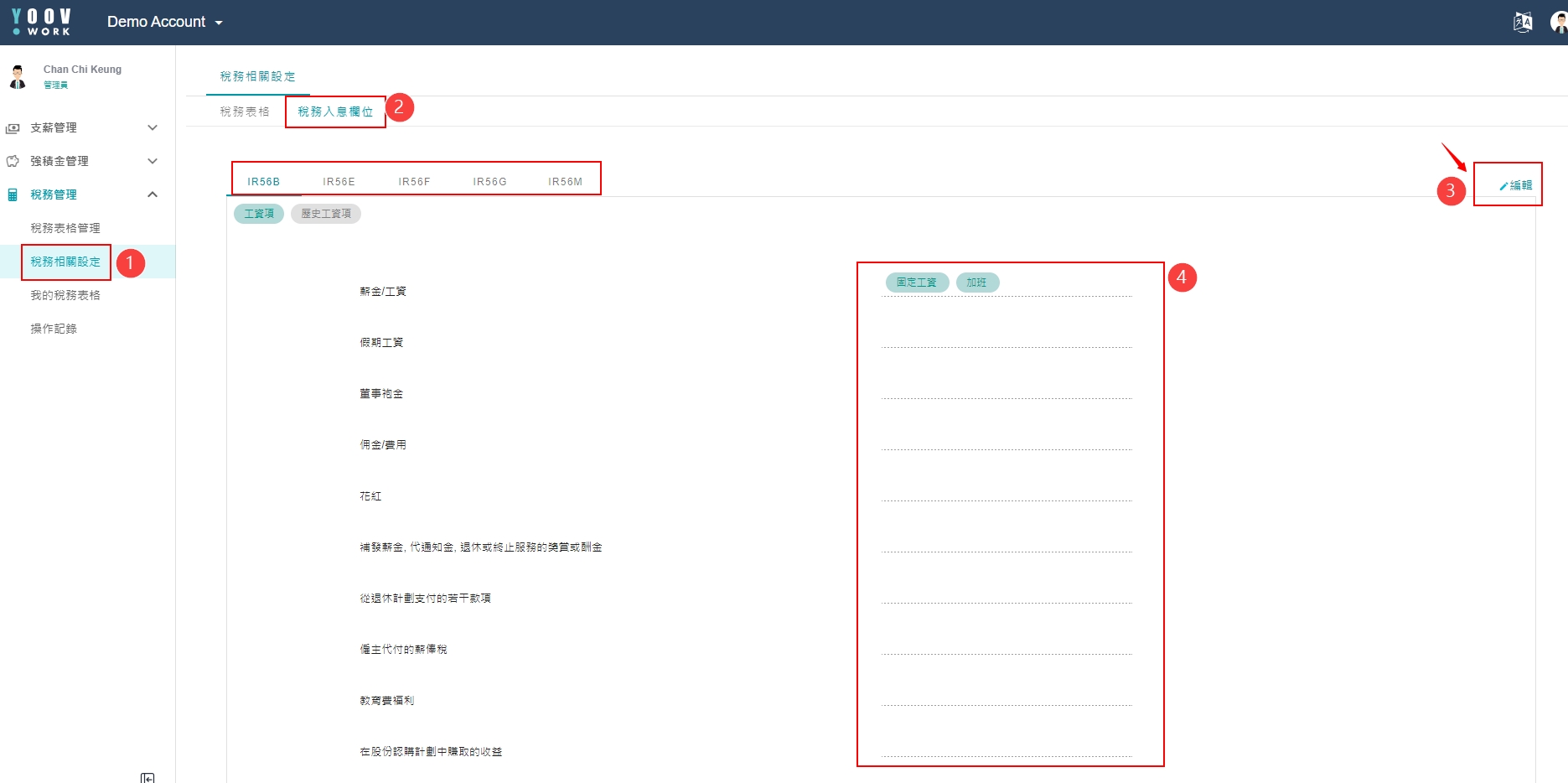 由于公司定的工资项分类可能和税务局报税表的预设的不同,所以系统亦需管理员在税务入息栏位中确认各工资项代表的意思。管理员需按[编辑],然后在各栏位拣选适合的工资项后按[保存]。