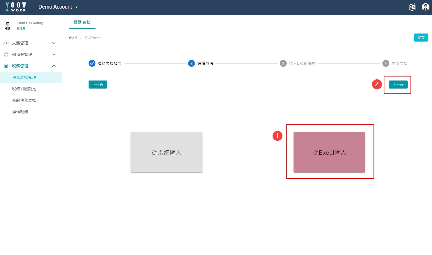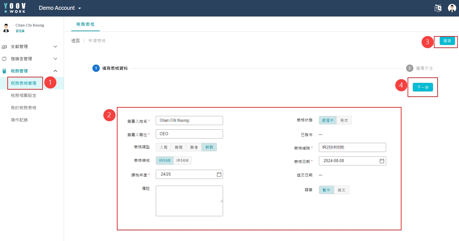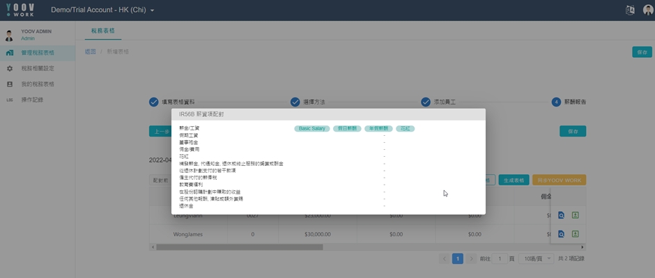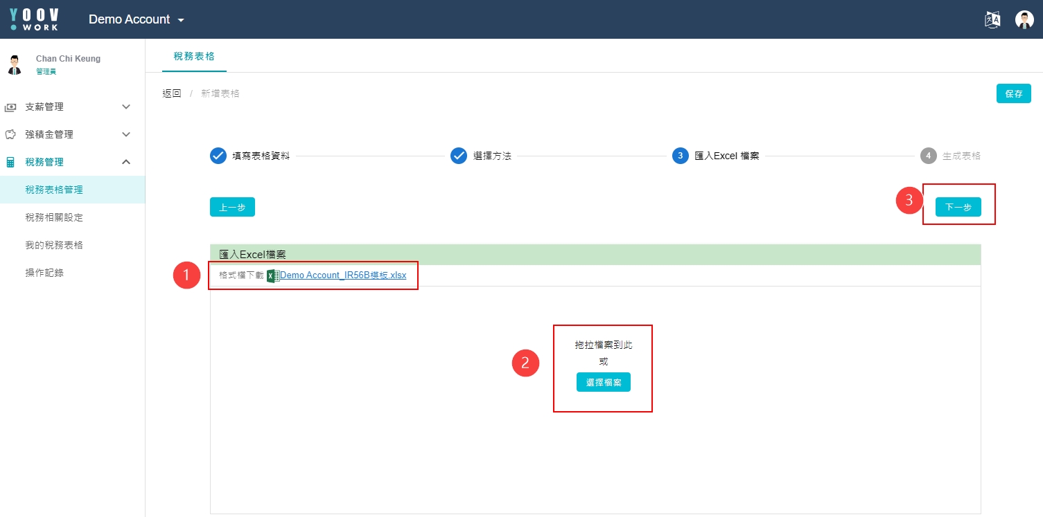 ① 系统页面允许拣选需要填写的税务表格例如: 入职、离职、离港和薪酬,拣选后请按[新增表格]。请先确保IR56表格薪资项配对正确。 ② 【填写表格资料 】 请在页面填写相关资料,当确认无误后请按[下一步]。 ③ 【选择方法】 汇入员工的税务资料可以有以下 2 个方法: 从 系统 或 Excel 汇入。管理员拣选后请按[下一步]添加员工。