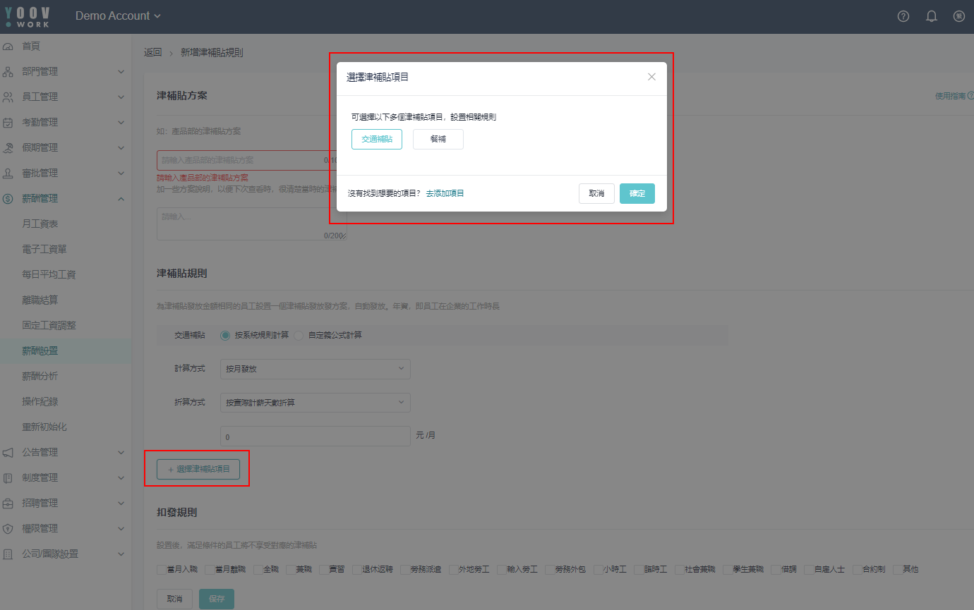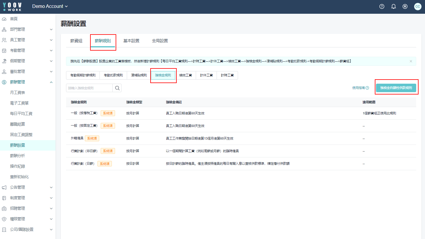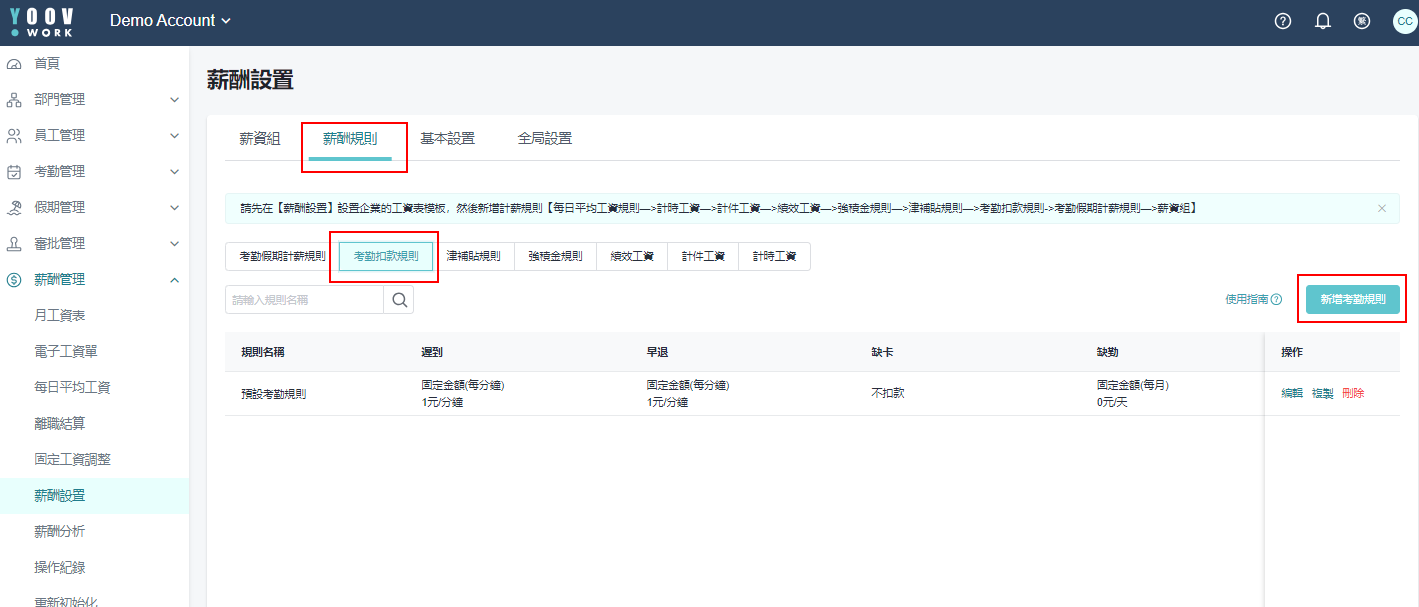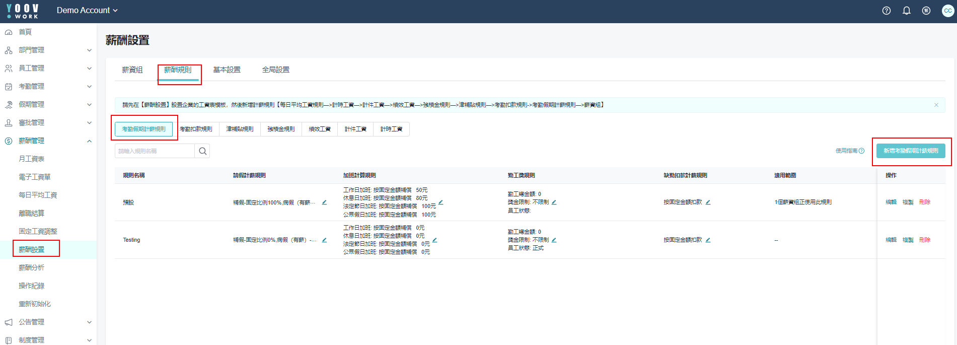 * 請注意：考勤計薪規則與假期管理互相呼應，因此需先設置假期才可以新增考勤計薪規則 。新增考勤假期計薪規則後，可以就各假期項目設置計薪比例。