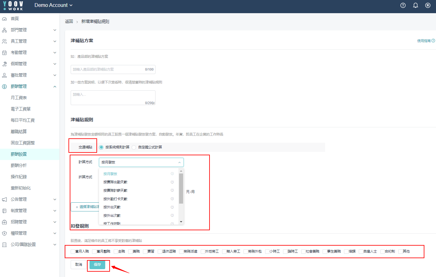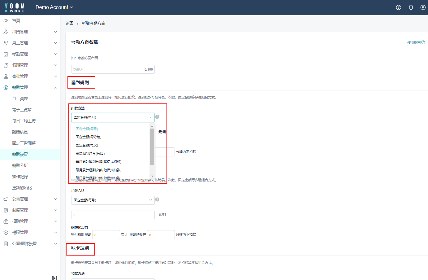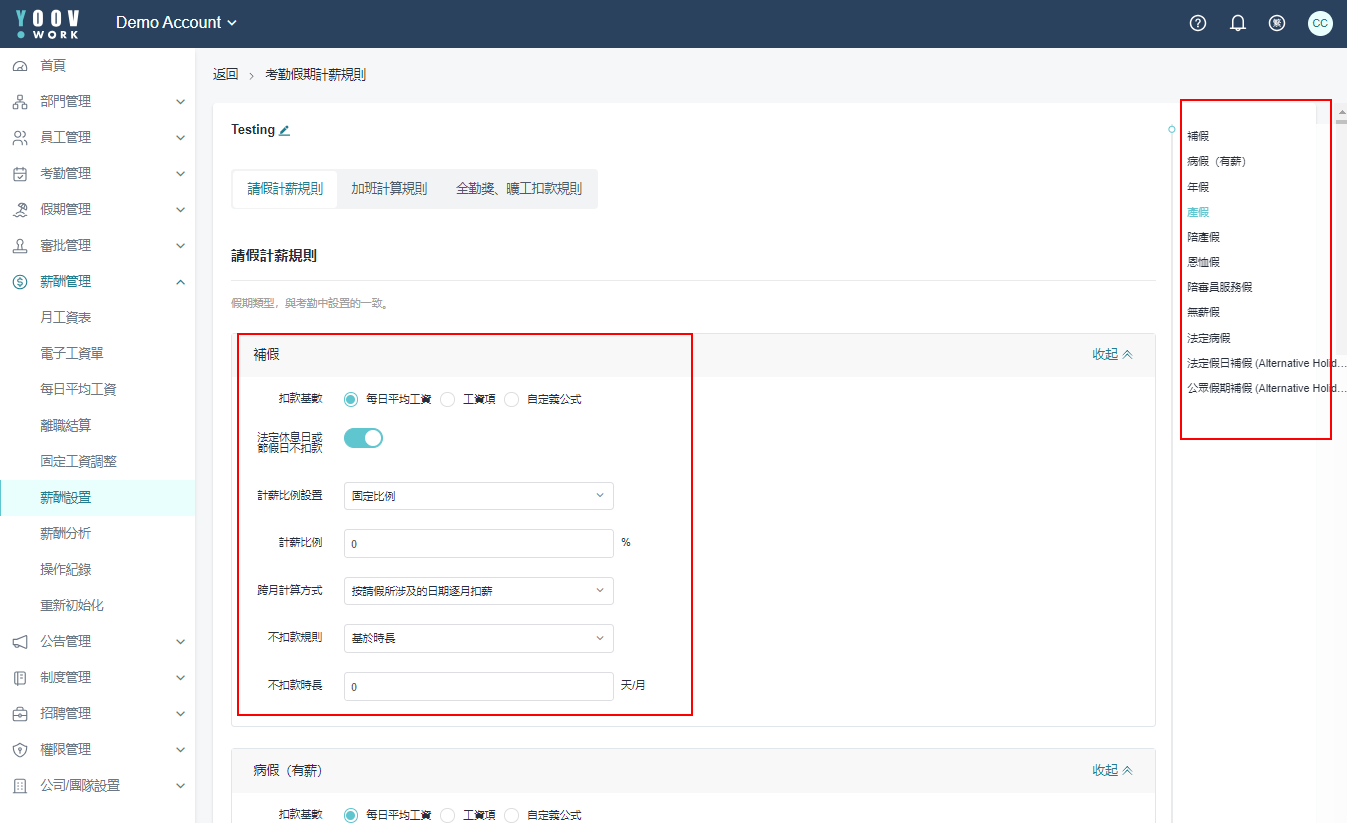 * 此部份允许管理员设置假期和考勤计算方式，系统会就相关的规则计算考勤和假期的扣款。