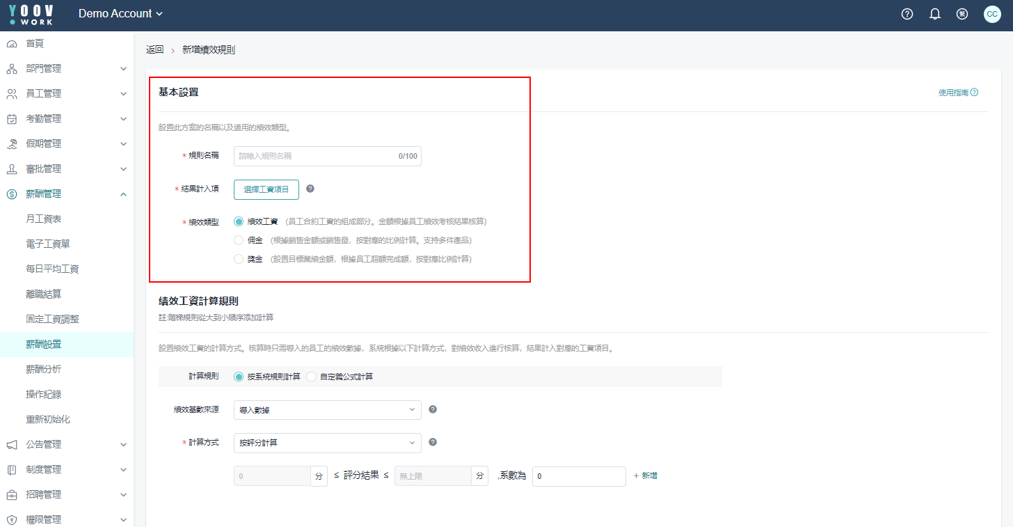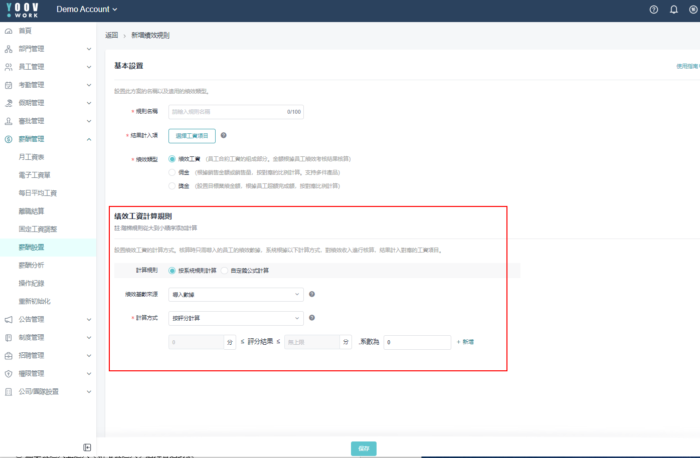 ③ 设置绩效工资计算规则，设置对应绩效类型的计算规则和计算方式，不同绩效类型的计算规则设置各不相同，设定完后点选 「保存」