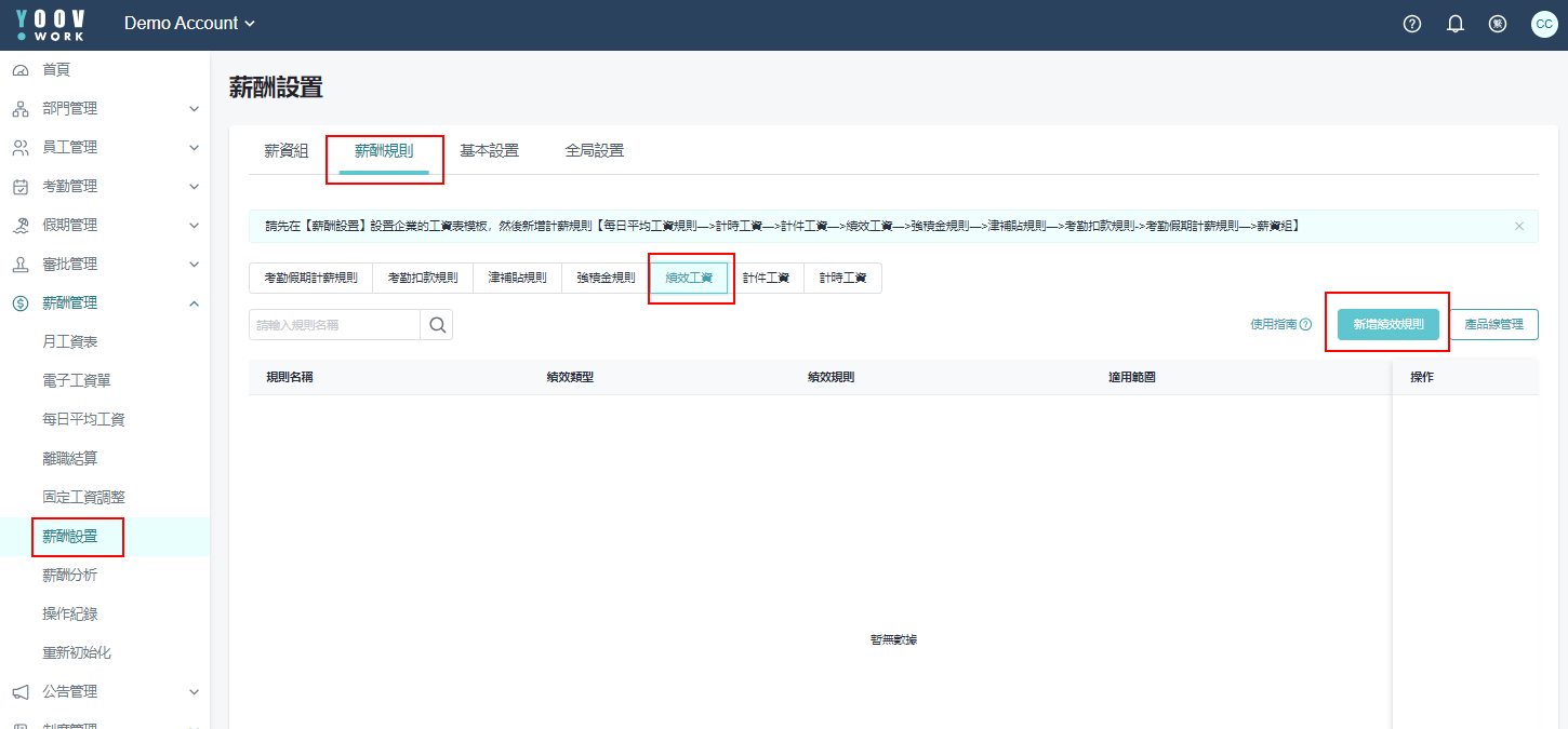 ①［薪酬管理］>［薪酬设置］>［薪酬规则］>［绩效工资］>［新增绩效规则］ \
