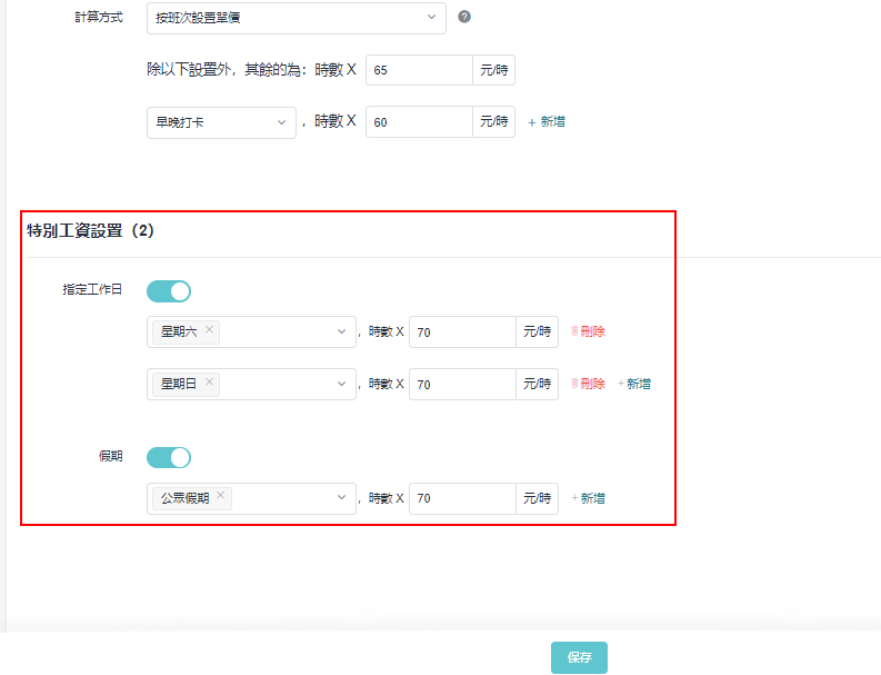 ③ 设定计时工资计算规则，设定计算规则、计算类型、额外设定、计算方式、特别工资设定等，设定完点选 「保存」