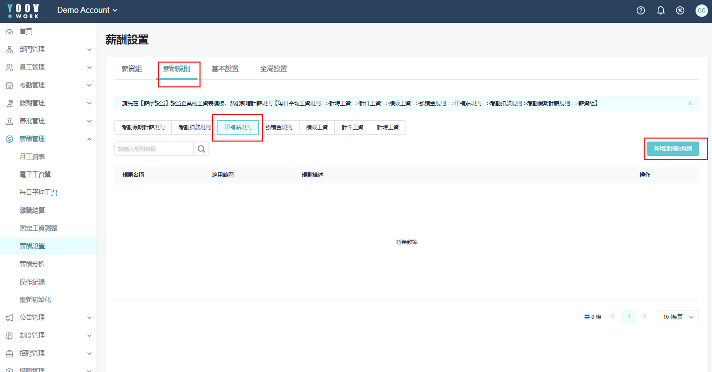 ［薪酬管理］>［薪酬设置］>［薪酬规则］>［津补贴规则］>［新增津补贴规则］