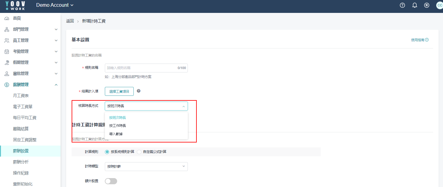 ② 基本设置，设定规则名称，选择薪资项目，选择会计方式（可选依班次时长、工作时长、汇入资料）\