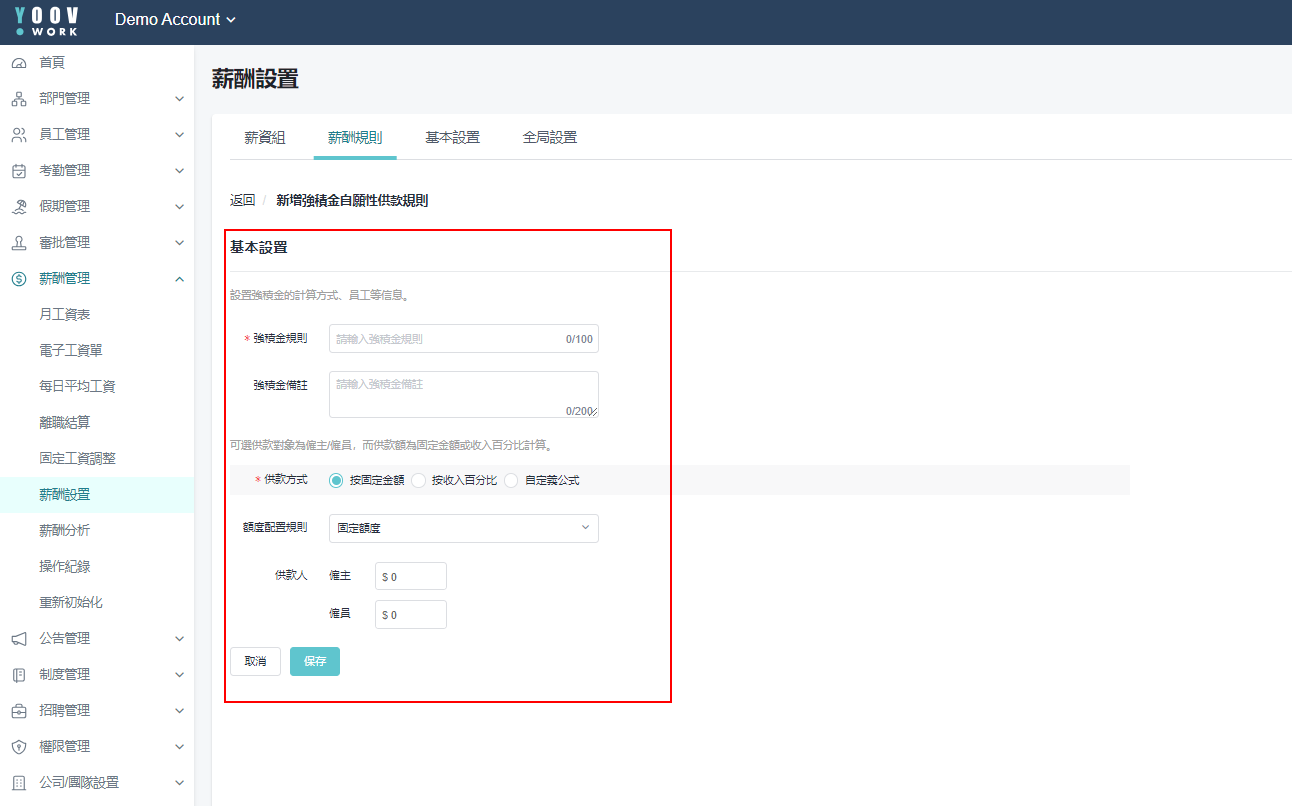 ③ 输入有关规则的设定。管理员可选［按固定金额］或［按收入百分比］两种供款方式。