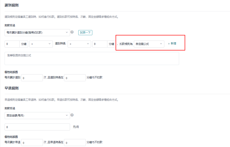 * 另外，阶梯式扣款方法也可以以自定义公式的方法设置扣款的计算方法，方便因应每个员工的固定工资而修改扣款比例。