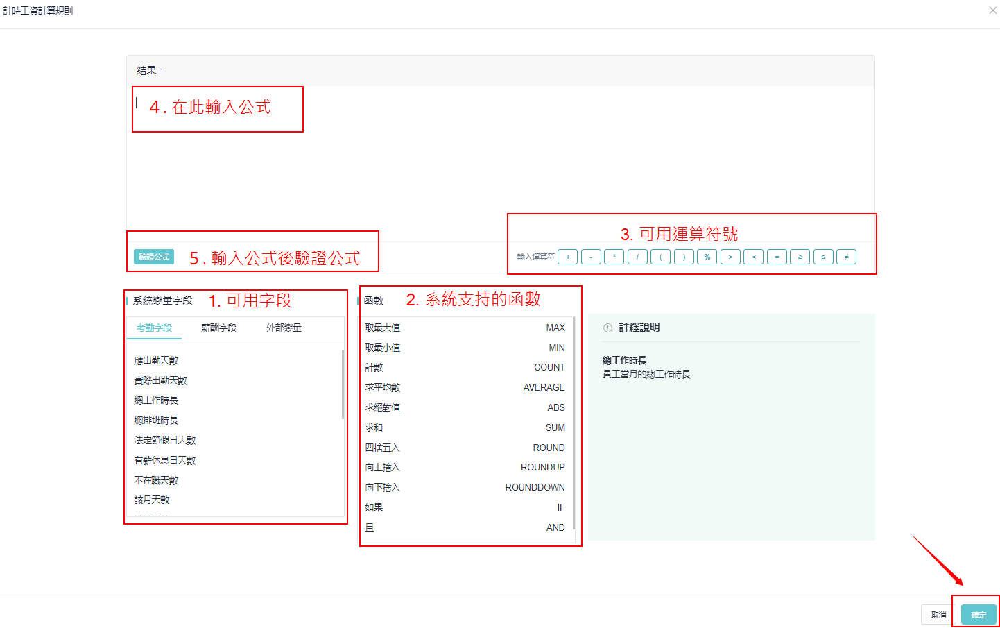 管理员能在系统变量字段中拣选所需的计算项去组成计算公式。设计公式后按验证公式测试是否可行。