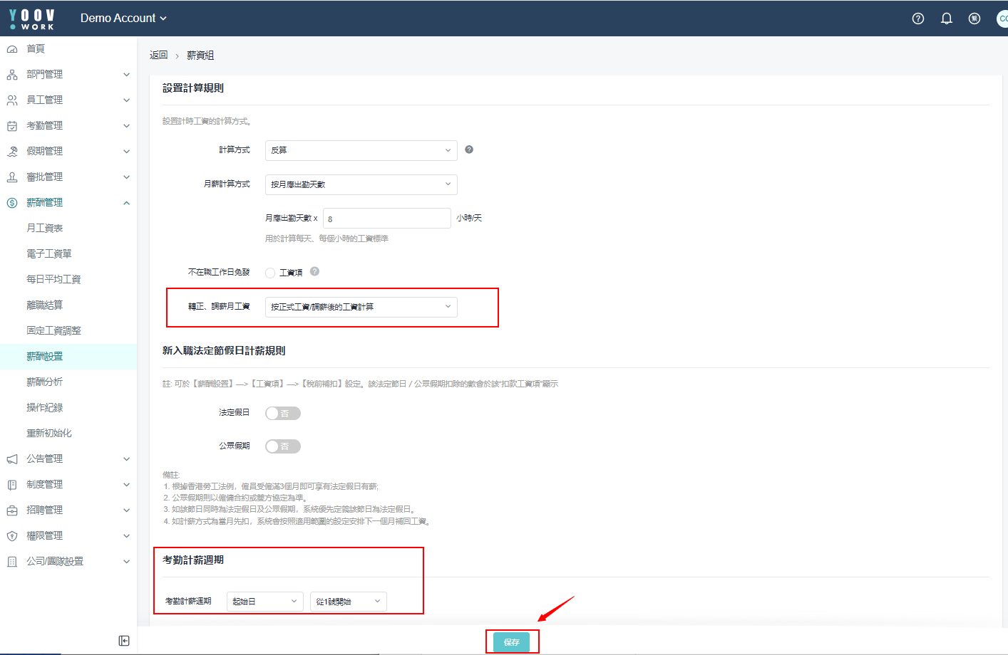 【月薪计算方式】 系统会依照月薪计算方式计算员工一个月有多少时间计薪。