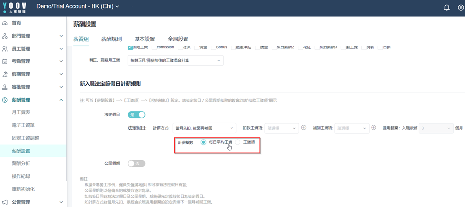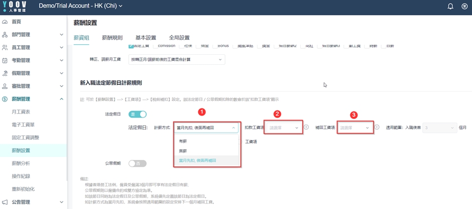 管理员亦可设置在员工入职首三个月期间放的法定假日或公众假期是否计薪,又或者会以「当月先扣,之后补回」 (意指首三个月因放法定假日而扣起的薪金,会在第四个月全数补发予员工)的形式处理﹔则可开启此设定。