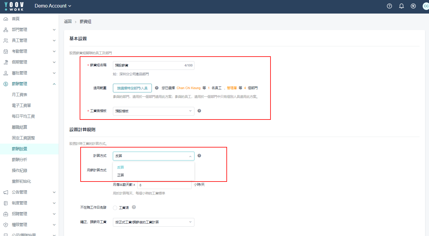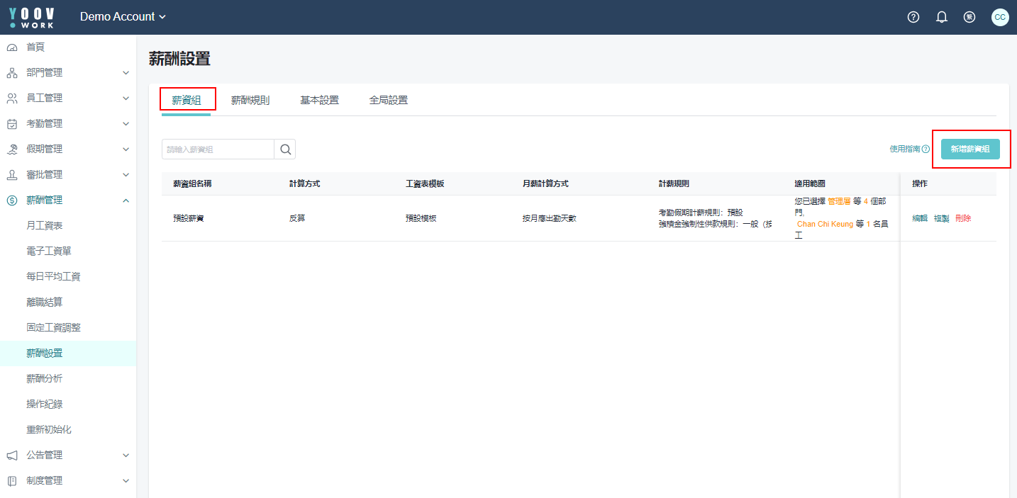 操作步骤: ①[薪资管理]>[薪资设定]>[薪资组]>[新增薪资组] ② 基础设置,设定薪资组名称、薪资组部门/员工、适用工资表模板 ③ 设定计算规则,设定计算方式、月薪计算方式、不在职工作日免发薪项、转正调薪月薪计算方式 ④ 关联计薪方案,设定好后,点选 「保存」