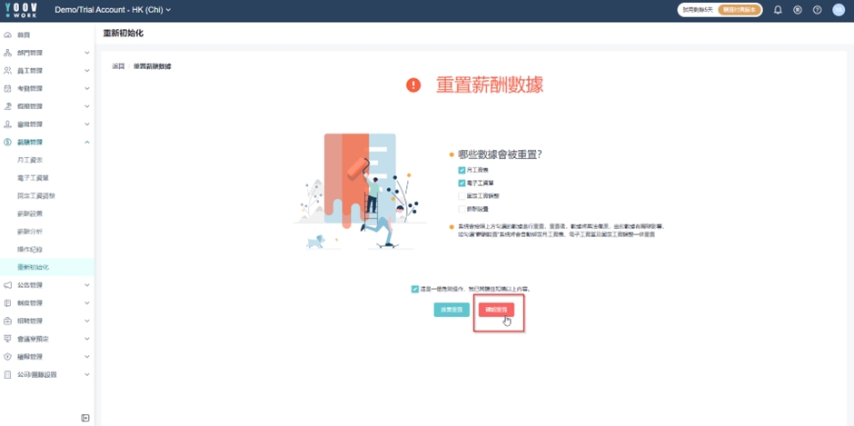 此外,由于数据有关联影响,如勾选 「薪酬设置」 系统将会自动绑定月工资表、电子工资单及固定工资调整一并重置。