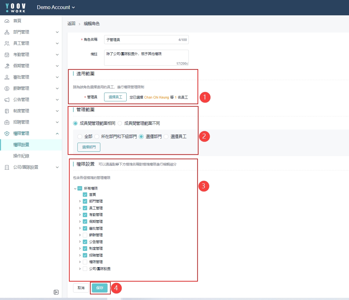 管理员亦能在系统中设置其他员工相关的权限和检视程度 。 例如 : 只局限该员工可以管理员工、审批薪酬等其他项目不获权限。