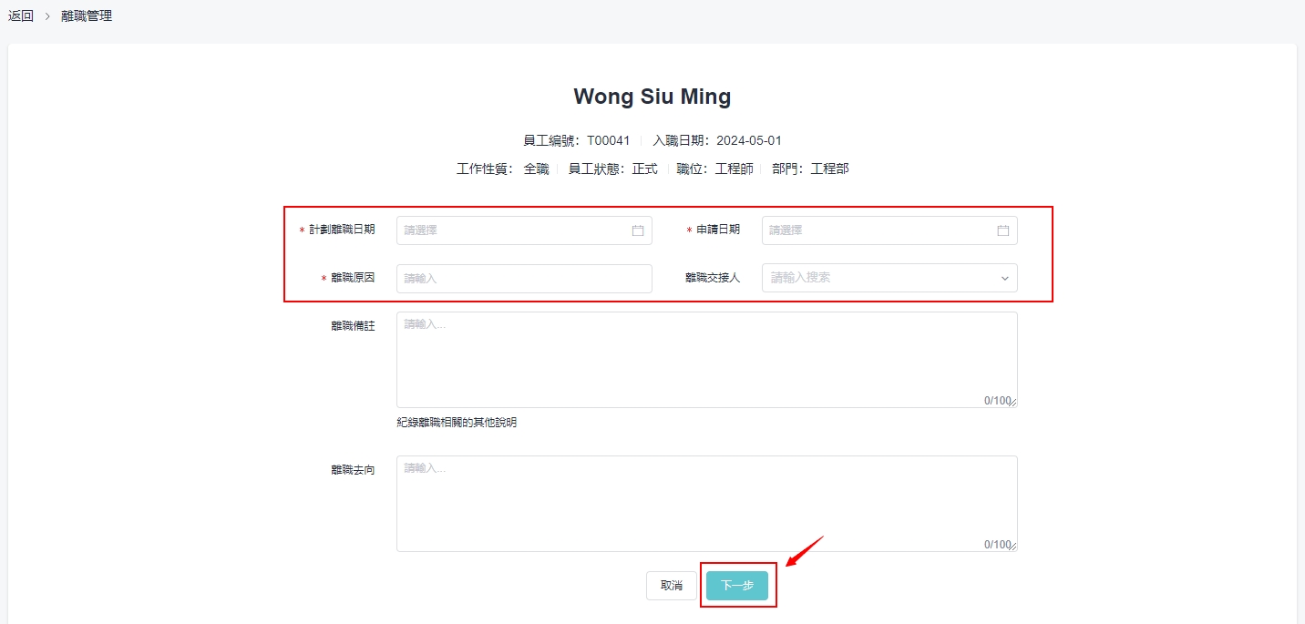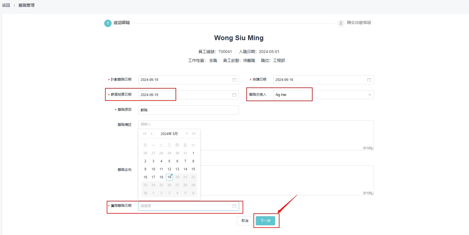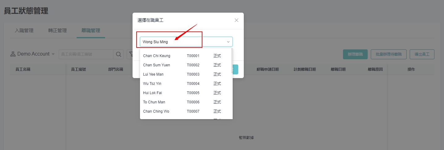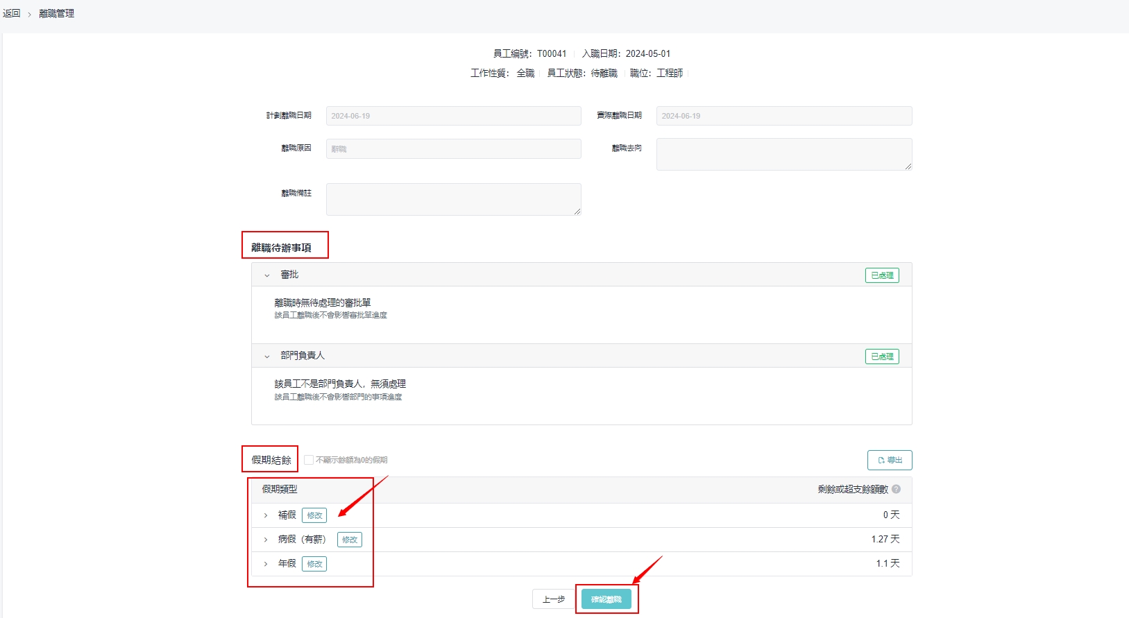 1.操作步骤: [员工管理]>[员工状态管理]>[离职管理]>[辨理离职] 2.选择需要辨理离职的员工,然后按[确定]。填写带*的资料,然后按[下一步]。 3.在离职管理的页面,会看见这员工的状态已转为待离职。接着按[确认离职]。填写离职资讯和实际离职日期,按[下一步]。 4.管理员可以确认离职待辨事项是否已处理好,例如是否还有申请未审批、发起的申请未通过等等。 5.也可透过查看剩余或超支余额数的假期(通常是年假)去计算应否向员工支付/收取年假的工资。 6.确认待辨事项后按[确认离职]。 7.完成后,员工档案的状态会显示为已离职。
