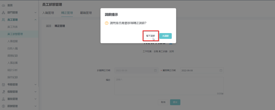 1.操作步骤: [员工管理]>[员工状态管理]>[转正管理]>[办理转正] 2.输入实际通过试用期的日子,然后按[提交]。 3.系统会弹出一个是否需要调薪的页面,以提醒试用期后是否需要调整薪金,可选择[暂不调薪] 4.进入员工档案后,员工状态会显示为正式。