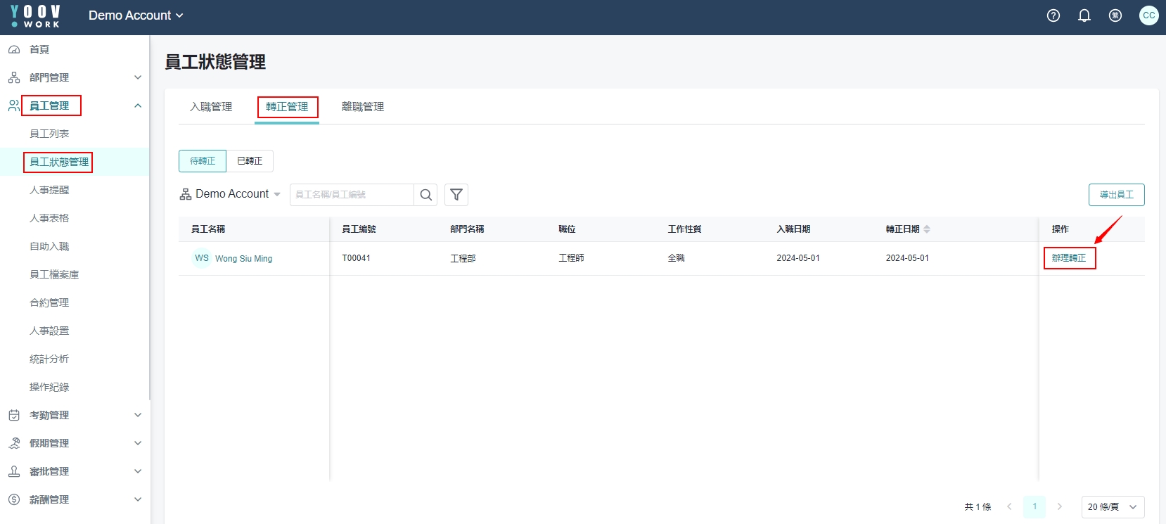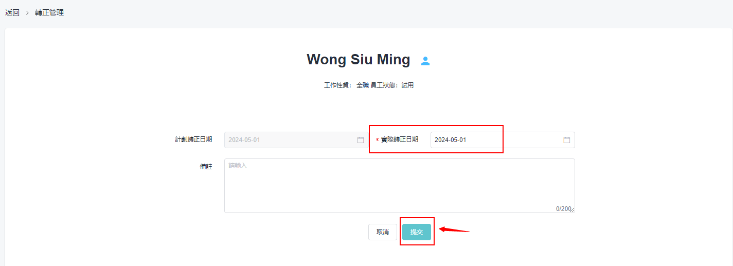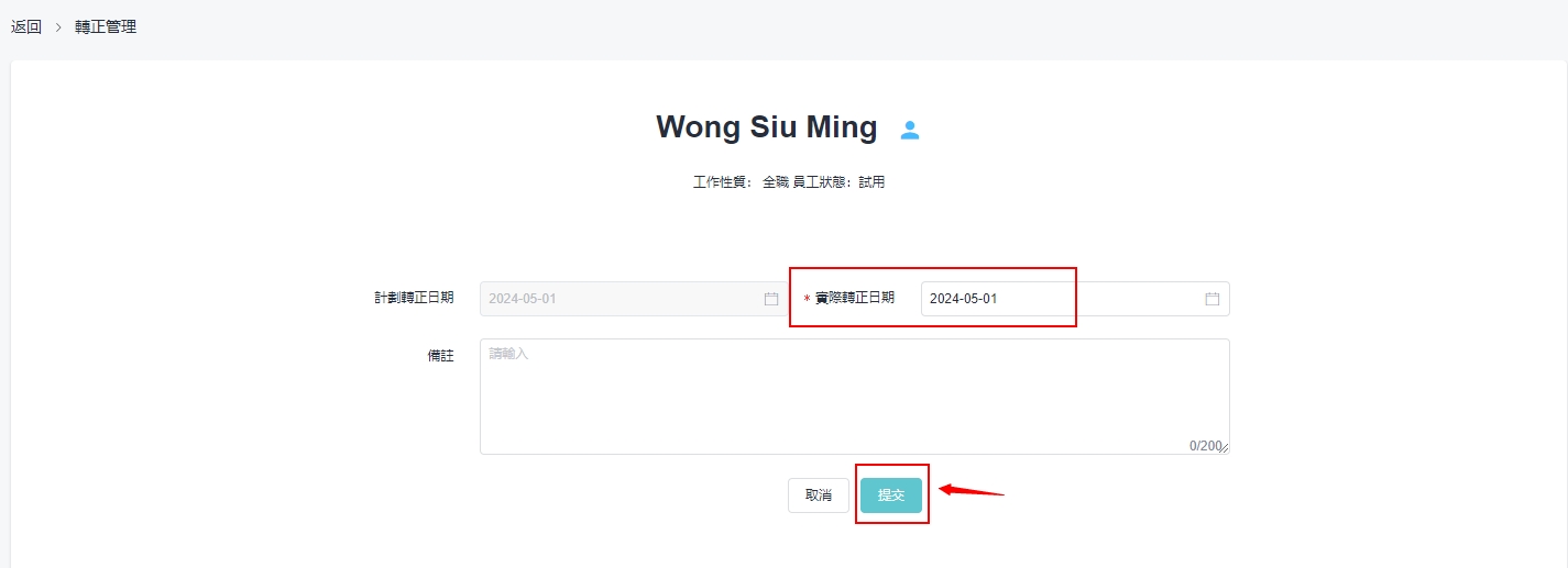 当员工已过试用期,管理员需要在系统帮他辨理转正手续,使他成为正式员工。