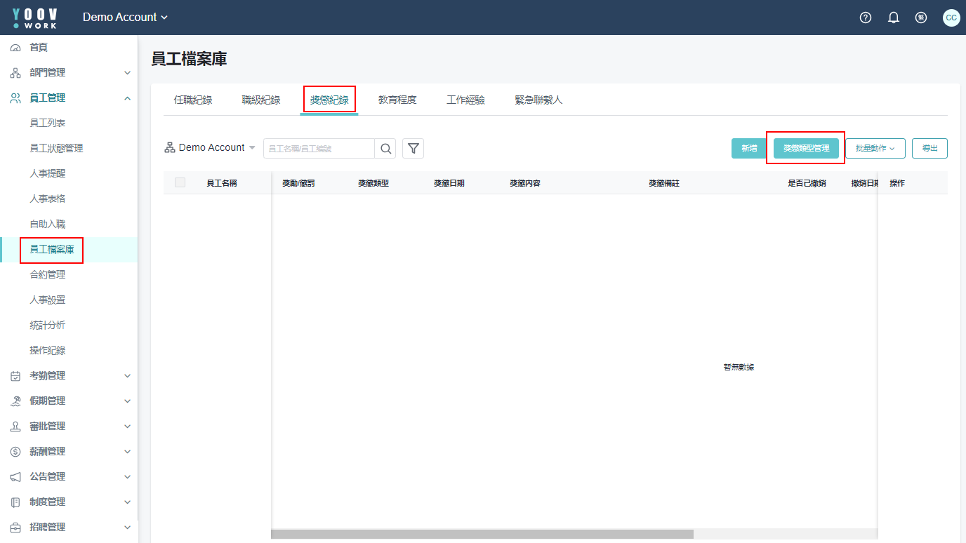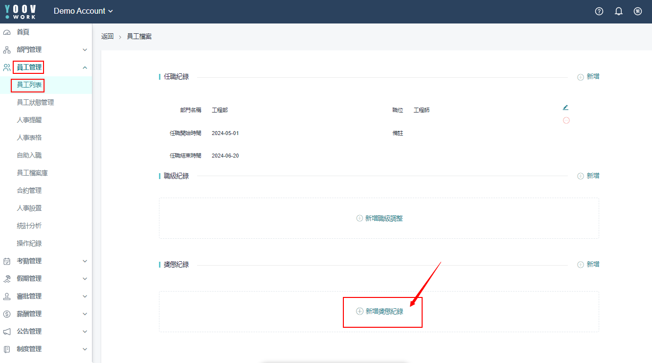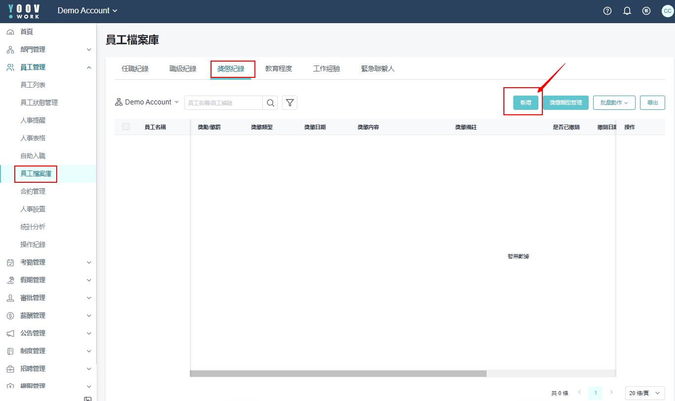 * 方法二 : 或可在员工档案里的 「奖惩记录」 里点选 「新增奖惩纪录」