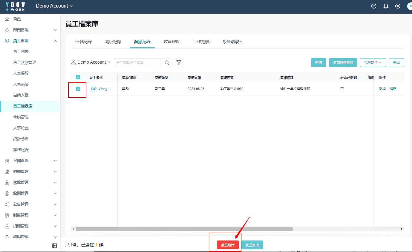 ［员工管理］>［员工档案库］>［奖惩纪录］，勾选需要删除的记录，可单选可多选 ，点选 「批量删除」