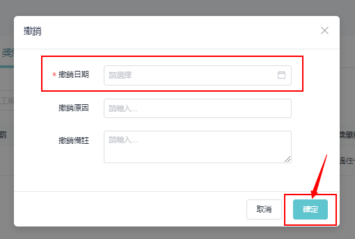 * 在撤销视窗中，选择撤销日期，输入撤销原因、备注，点选 「确定」