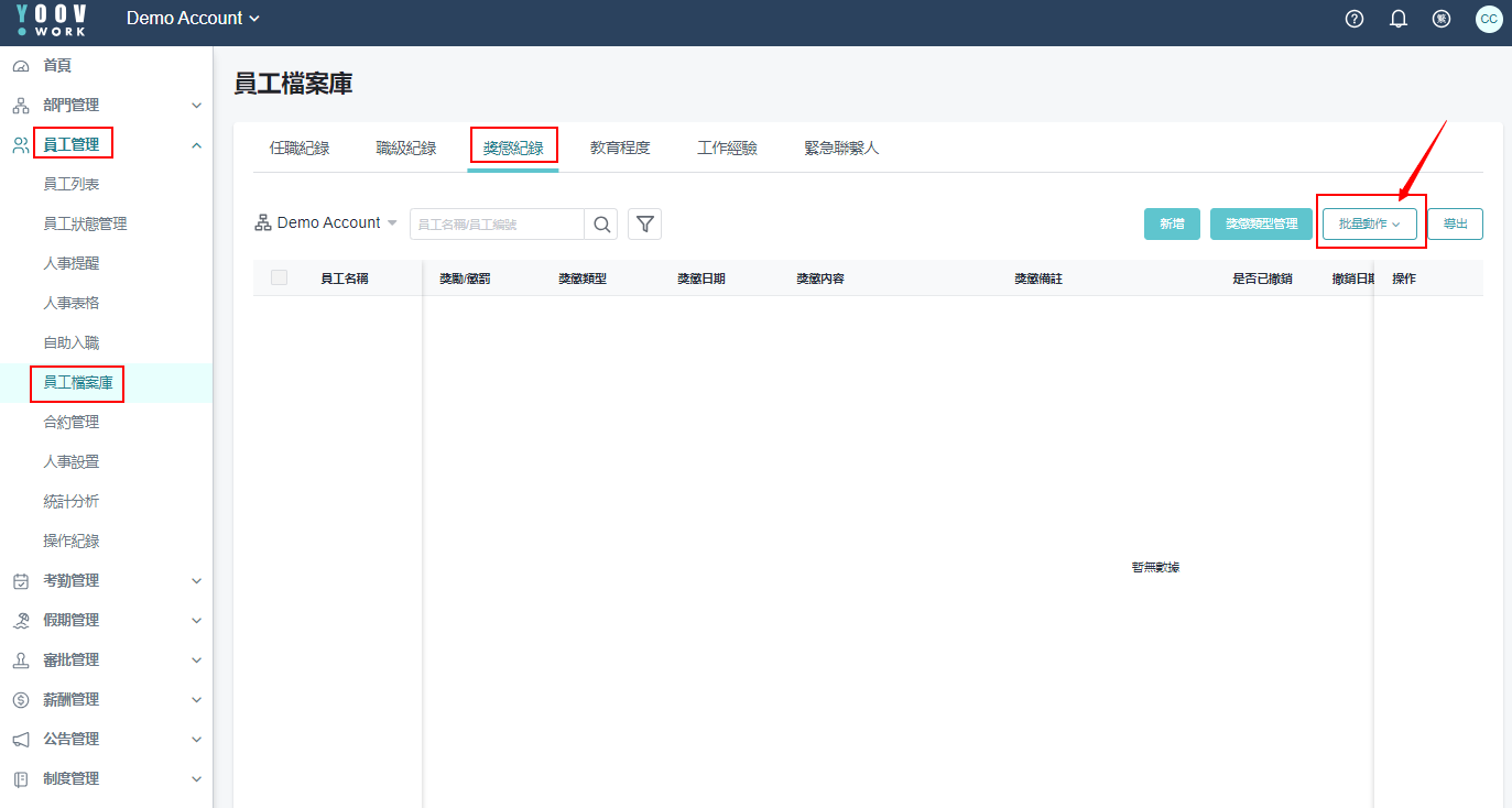 ①［员工管理］>［员工档案库］>［奖惩纪录］>［批量动作］>［批量导入］ \