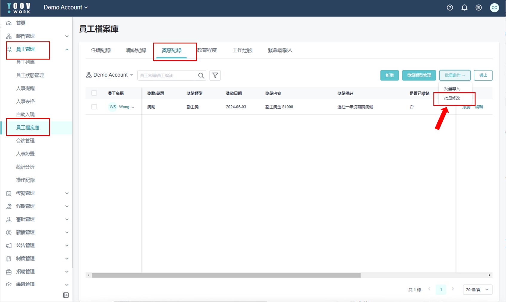 ①［员工管理］>［员工档案库］>［奖惩纪录］>［批量动作］>［批量修改］ \