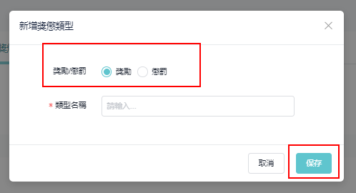 * 在新增奖励惩戒类型的弹出窗口中，选择 「奖励/惩罚」，输入类型名称，点选 「保存」。
