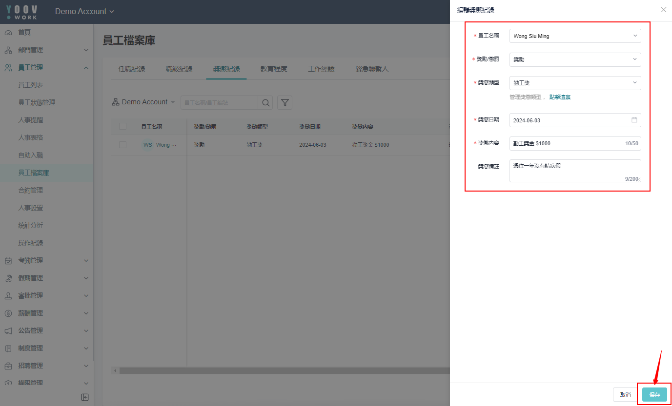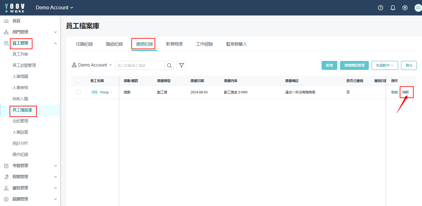 ［员工管理］>［员工档案库］>［奖惩纪录］，点选对应员工按下 「编辑」