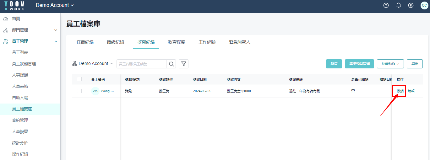 ［员工管理］>［员工档案库］>［奖惩纪录］，点选对应员工按下 「撤销」