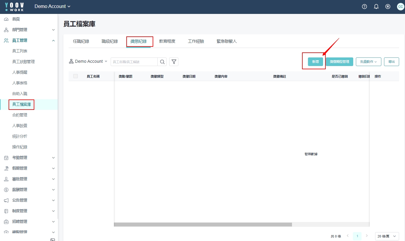 方法二 : 或可在员工档案里的 「奖惩记录」 里点选 「新增奖惩纪录」