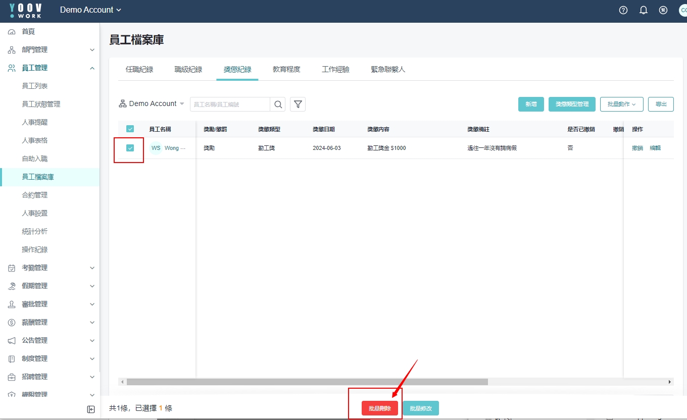 操作步骤: [员工管理]>[员工档案库]>[奖惩纪录],勾选需要删除的记录,可单选可多选 ,点选 「批量删除」
