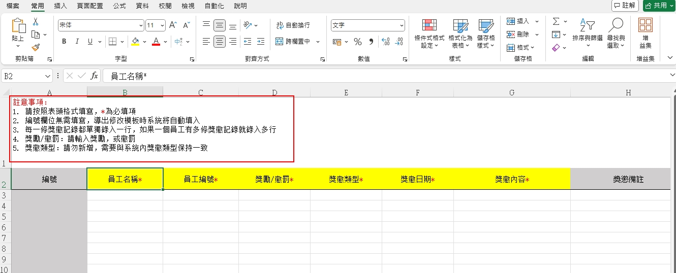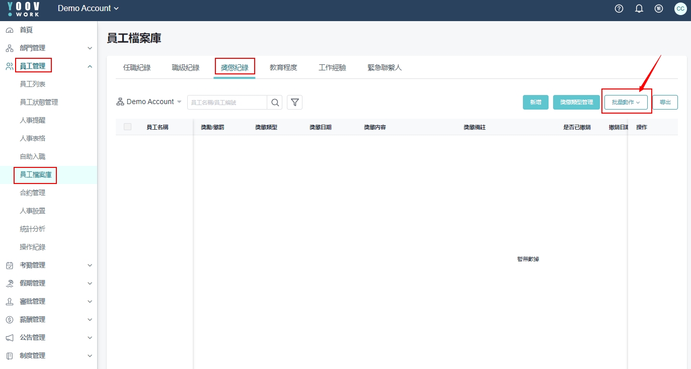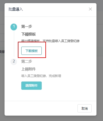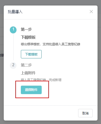 操作步骤: ①[员工管理]>[员工档案库]>[奖惩纪录]>[批量动作]>[批量导入] ② 在批量导入窗口,点击 「下载模板」 ③ 按要求填写范本内容,如下范例,填写后储存文档 ④ 返回批量导入窗口,点选 「选择附件」,上传即可完成新增 ⑤ 如果汇入失败,您可以根据提示,汇出错误资料文件,查看错误说明