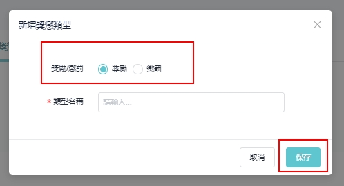 在新增奖励惩戒类型的弹出窗口中,选择 「奖励/惩罚」,输入类型名称,点选 「保存」。