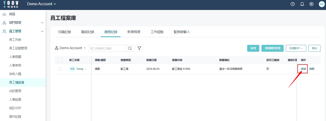 操作步骤: [员工管理]>[员工档案库]>[奖惩纪录],点选对应员工按下 「撤销」